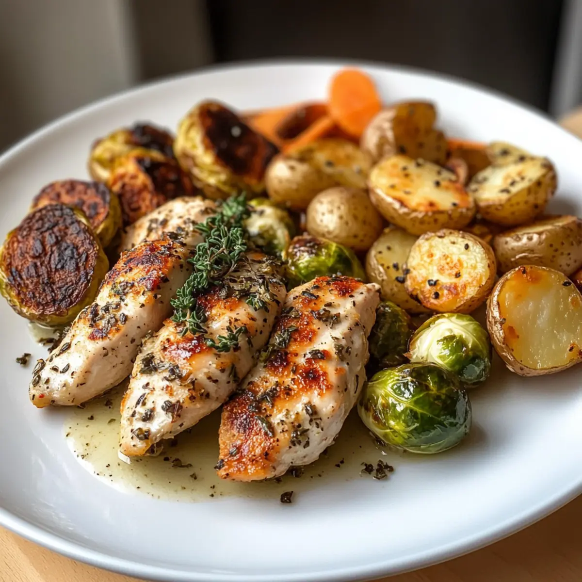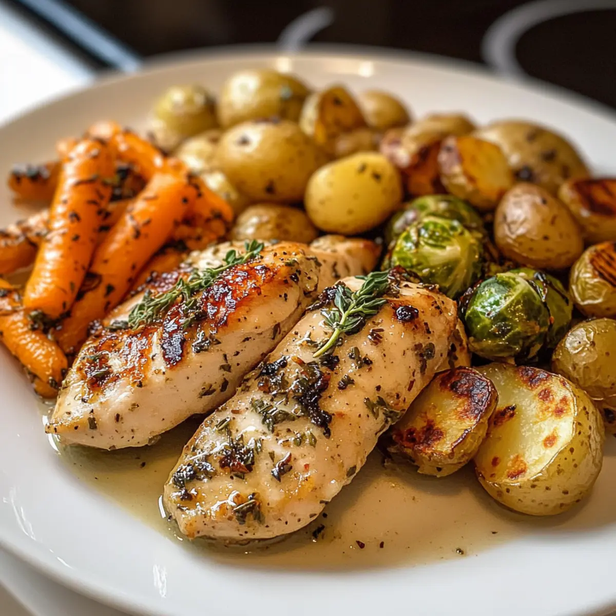 Arrangieren Sie das Hühnchen und das vorbereitete Gemüse kunstvoll auf einer großen Servierplatte. Geben Sie die cremige Sauce darüber und garnieren Sie das Buffet mit frischen Thymianzweigen, um einen zusätzlichen Farbtupfer und Geschmack zu verleihen.