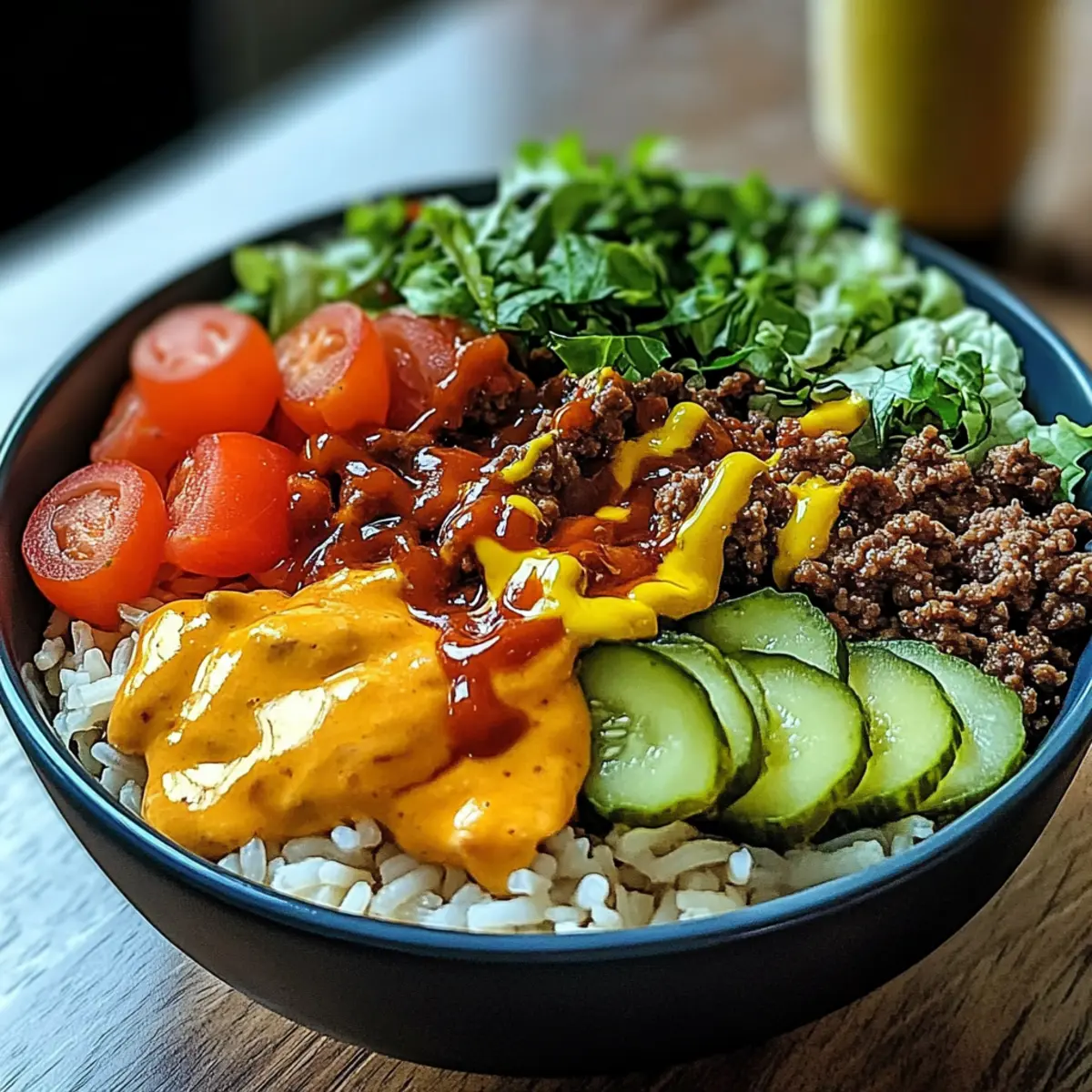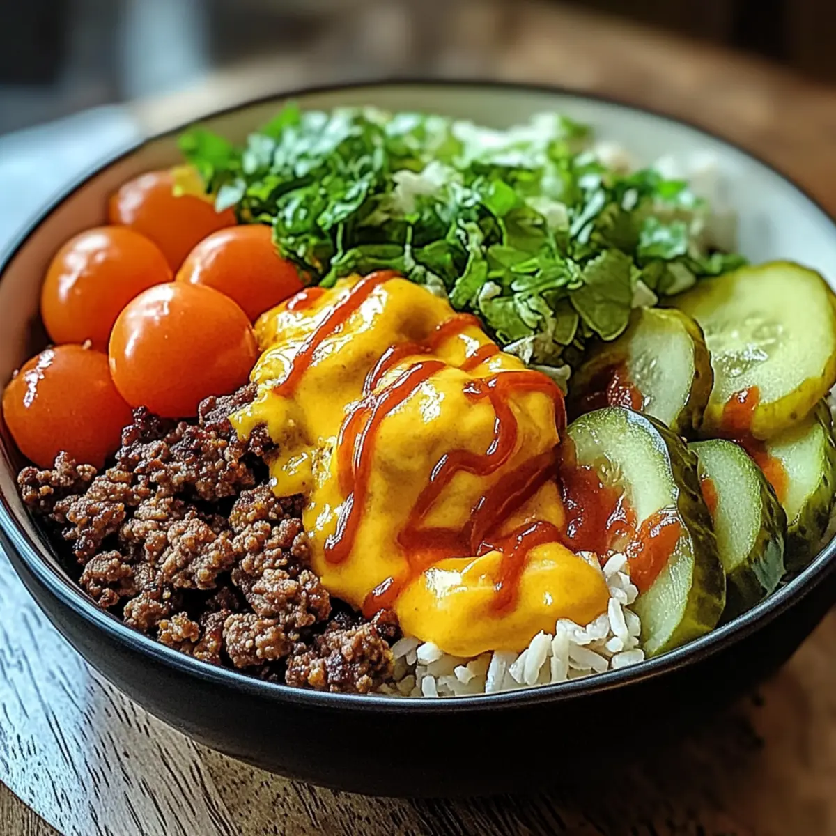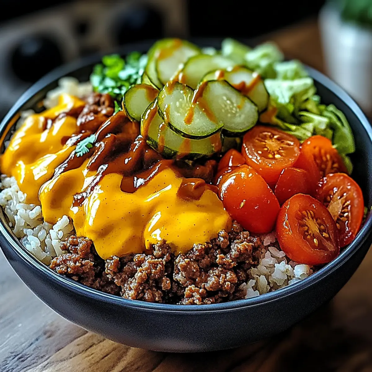 Nehme tiefere Schalen und beginne mit einer Schicht des gekochten braunen Reises als Basis. Füge dann das gebräunte Rindfleisch hinzu, gefolgt von einer großzügigen Portion geriebenem Salat, Kirschtomaten und Scheiben von Gewürzgurken. Streue zuletzt den geschmolzenen Cheddar über die Schalen, um das herzhaft-hungrige Gefühl eines Burgers perfekt zu imitieren.