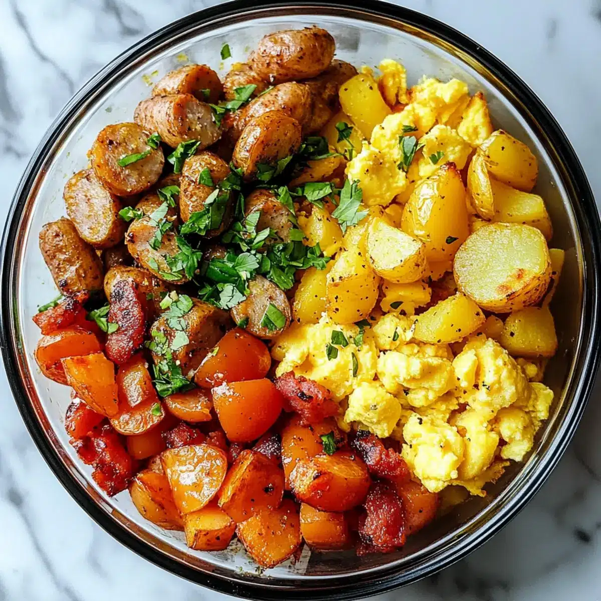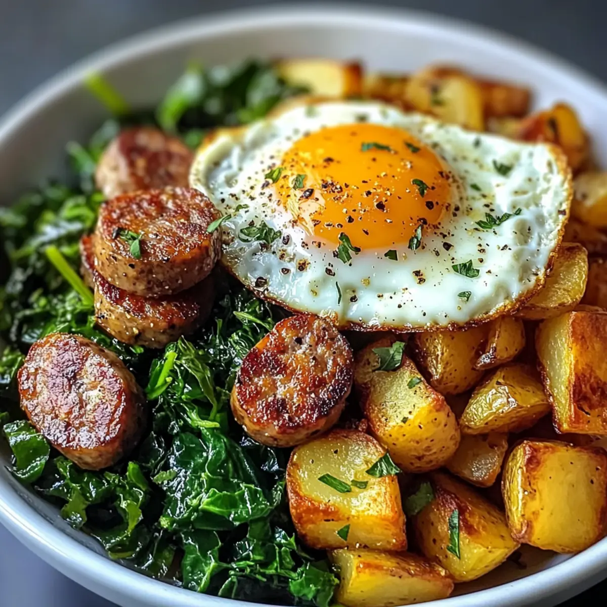 Herzhafter Frühstücks-Power-Bowl mit Wurst und Eiern