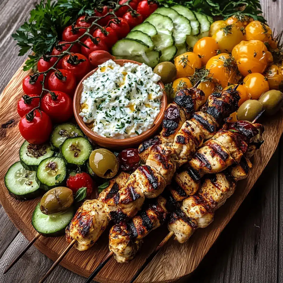 Griechisches Hähnchen Souvlaki Schlemmerplatte mit Feta-Dip