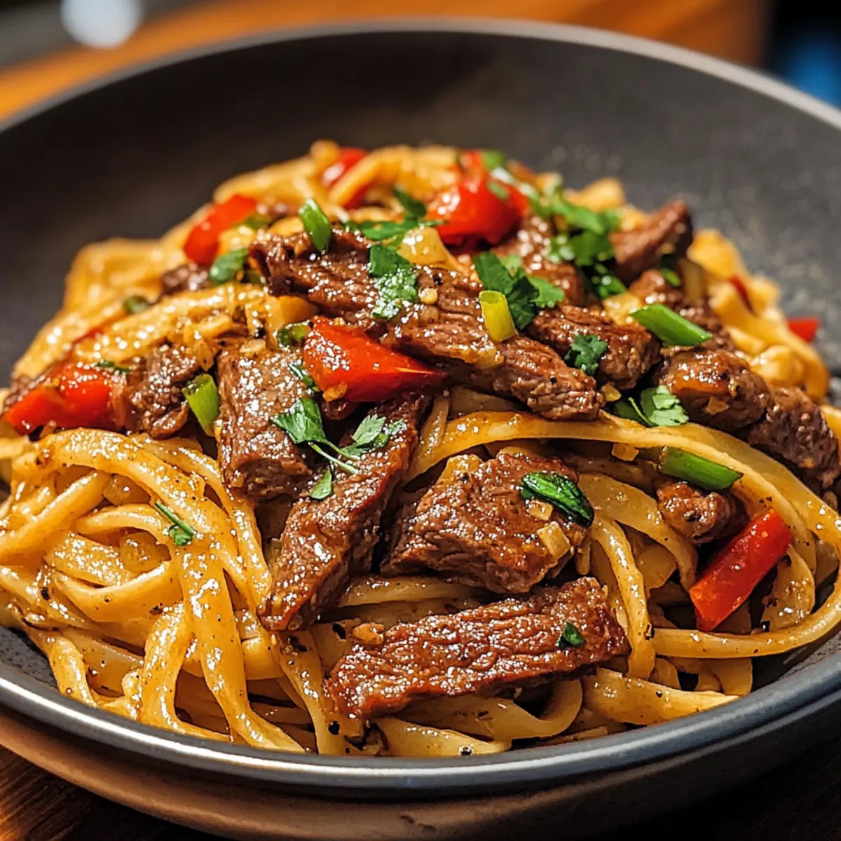 Süße und scharfe Knoblauch-Rindersteak-Pasta schnell genießen