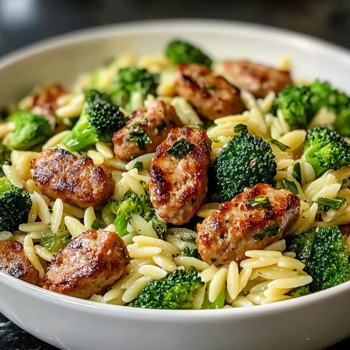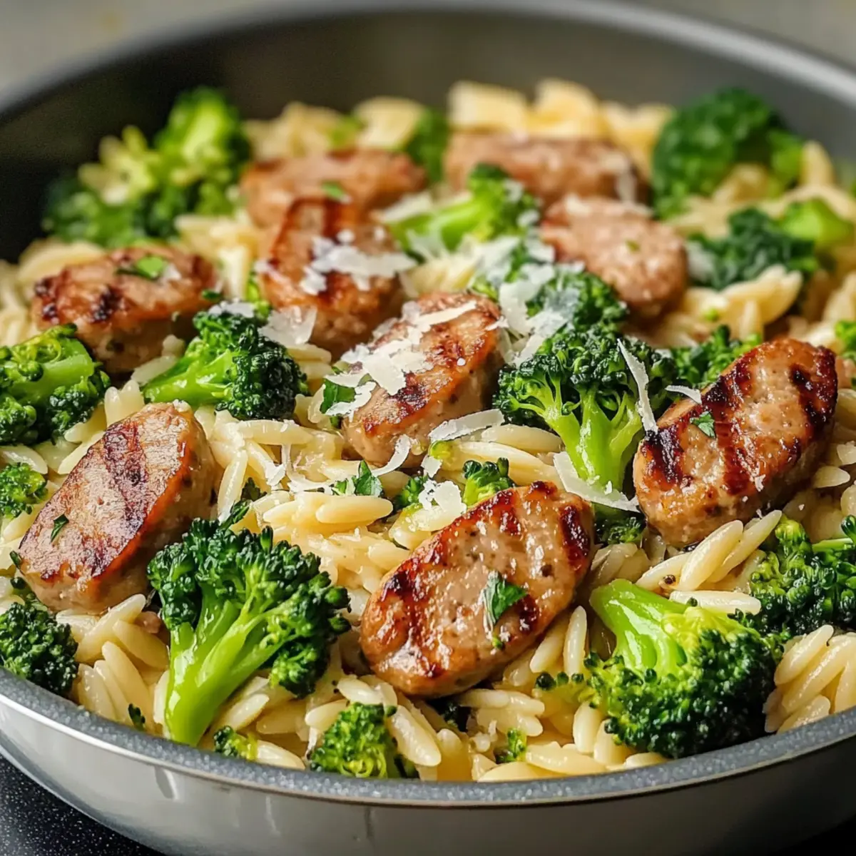 Hähnchenwurst und Brokkoli Orzo in einem Topf