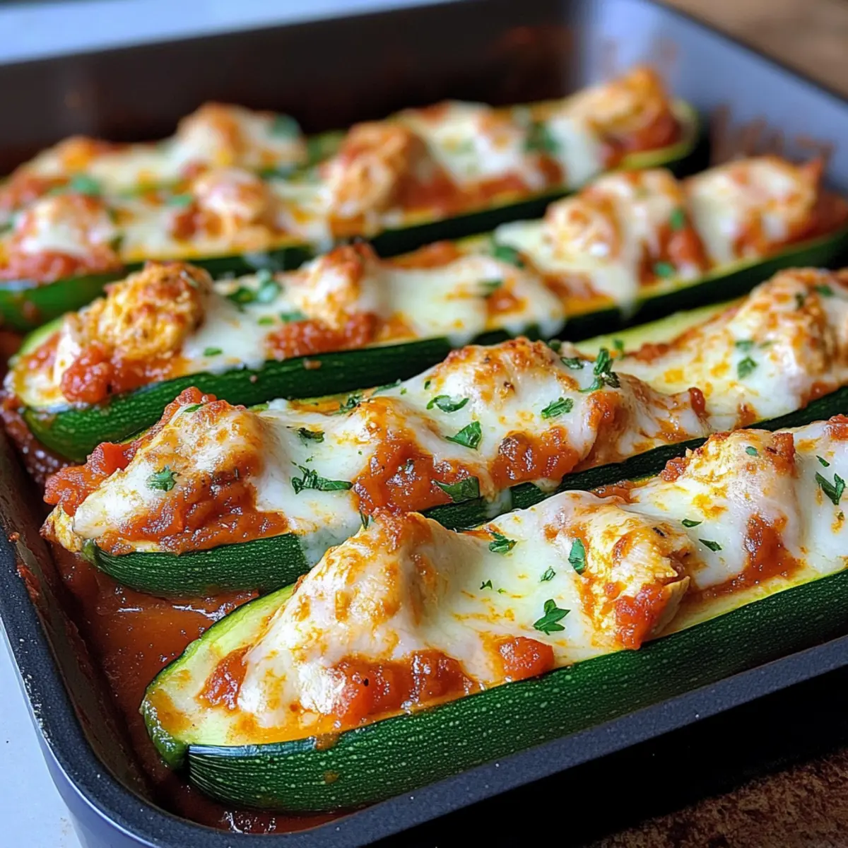 Hähnchen Parmesan Zucchini Boote für gesunde Feinschmecker