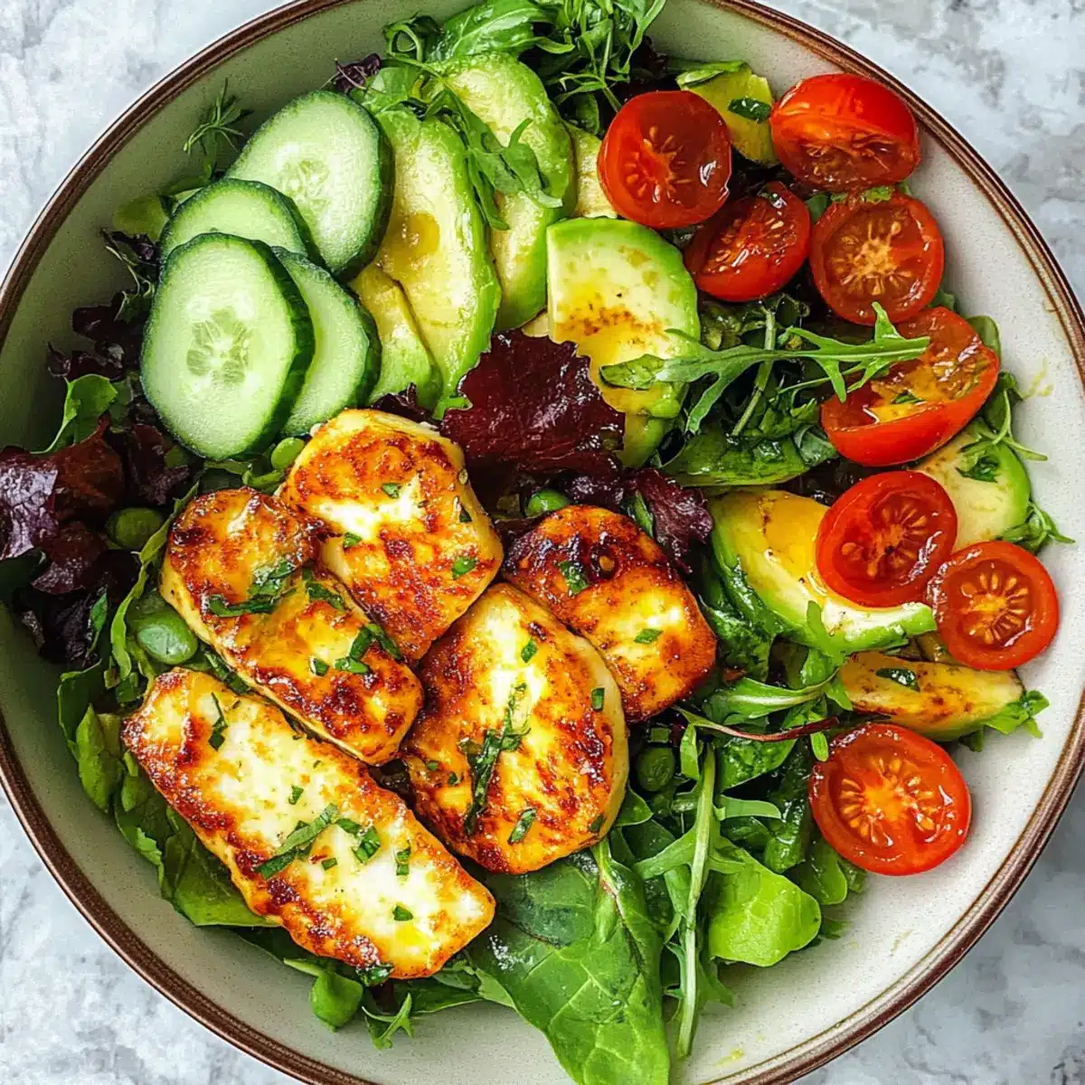 Avocado Halloumi Salat mit mediterranem Dressing
