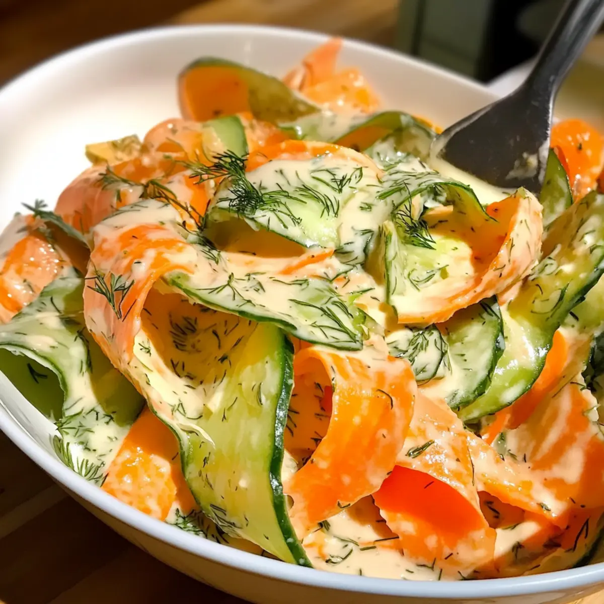 Karotten- und Gurkenband-Salat mit cremigen Dill-Dressing