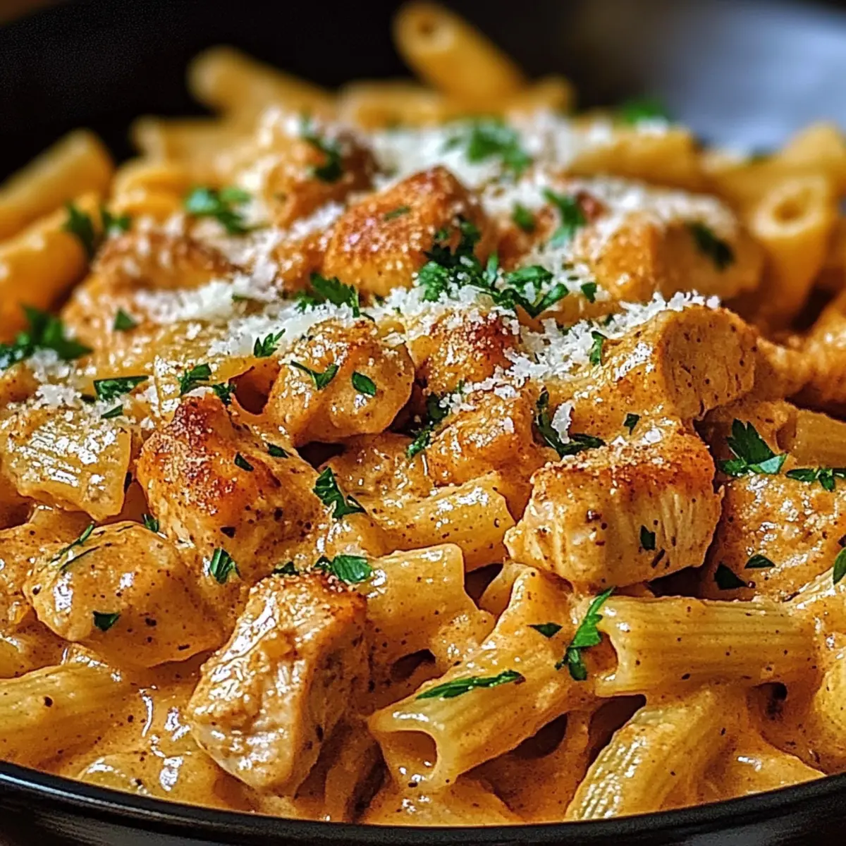 - Verteile die Cowboy Butter Hähnchen Pasta auf Teller und bestreue sie großzügig mit geriebenem Parmesan. Garniere das Gericht mit frischer Petersilie für einen Farbtupfer und serviere es warm.