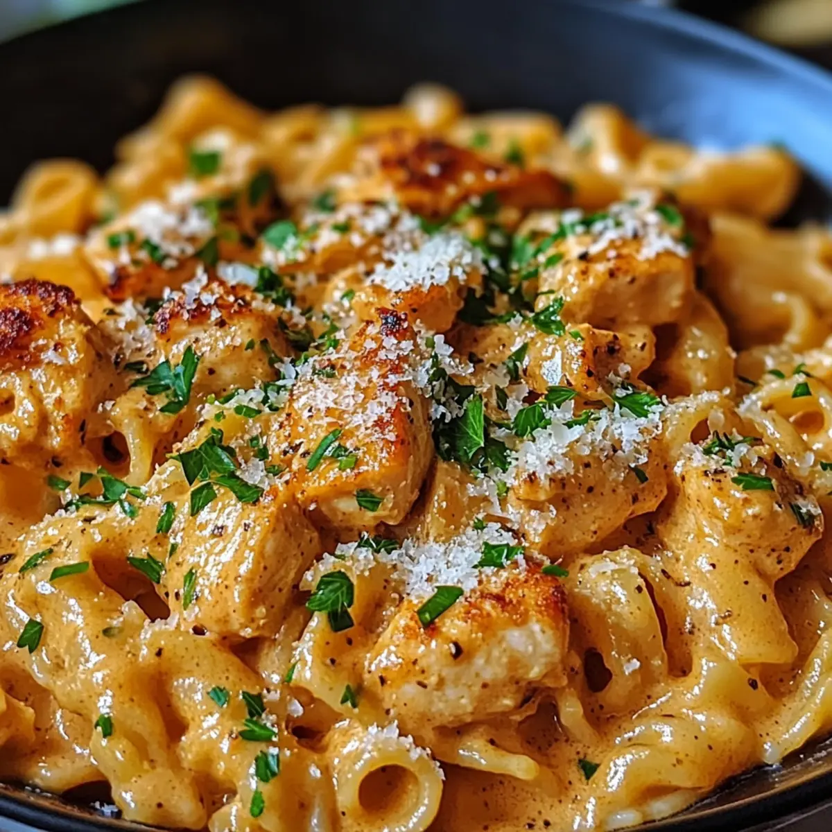 Unwiderstehliche Cremigkeit: Die Kombination aus zartem Hähnchen und perfekt gegarter Pasta in einer reichhaltigen Sauce wird deine Geschmacksknospen verzaubern. Lass dich von diesem Rezept begeistern und entdecke die Freude am Kochen wieder!