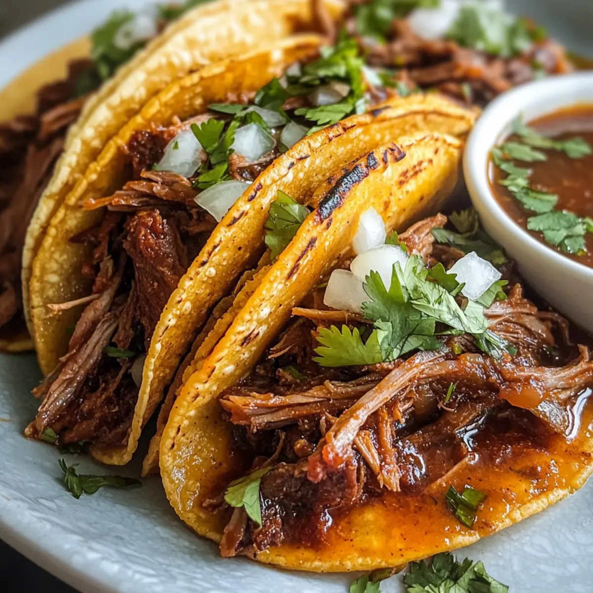 Servieren Sie Ihre Crockpot Birria Tacos mit der restlichen Brühe zum Dippen sowie frischem Koriander und gewürfelten Zwiebeln. Diese Kombination aus Aromen und Texturen wird sicher alle am Tisch begeistern und sorgt für ein authentisches mexikanisches Erlebnis.