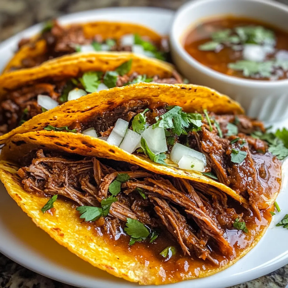 - Crockpot Birria Tacos mit Brühe, Koriander und Zwiebeln servieren.
