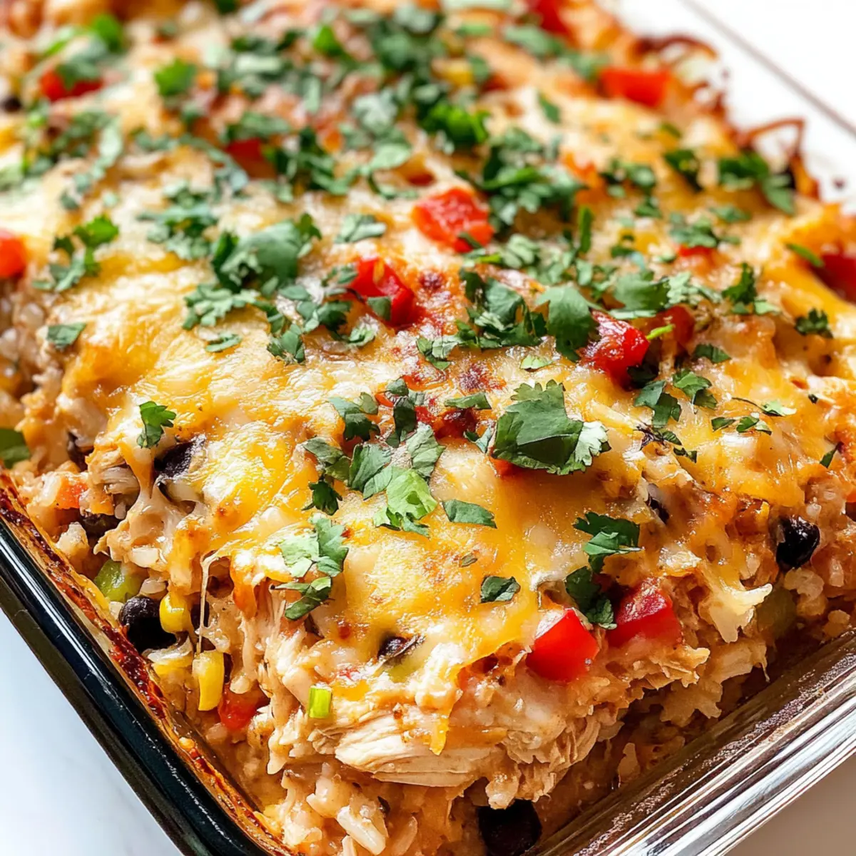 Lasse den Auflauf nach dem Backen für etwa 5 bis 10 Minuten abkühlen, damit er sich besser setzen kann. Serviere ihn warm, optional garniert mit frischem Koriander, Frühlingszwiebeln, Salsa und Avocado. Diese zusätzlichen Toppings bringen frische Aromen und Texturen in den Einfachen Hühnchen-Burrito-Auflauf und machen ihn noch schmackhafter.