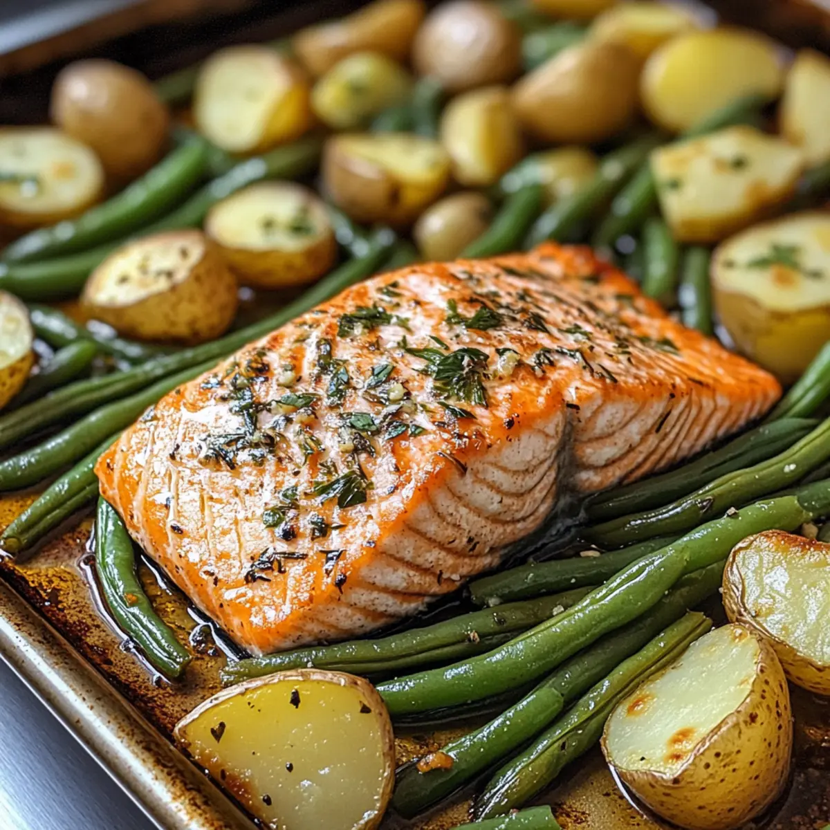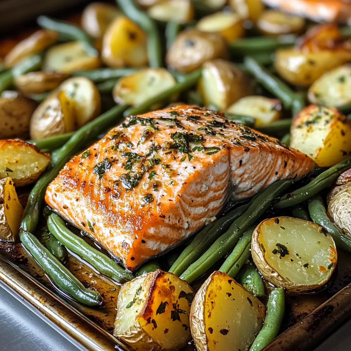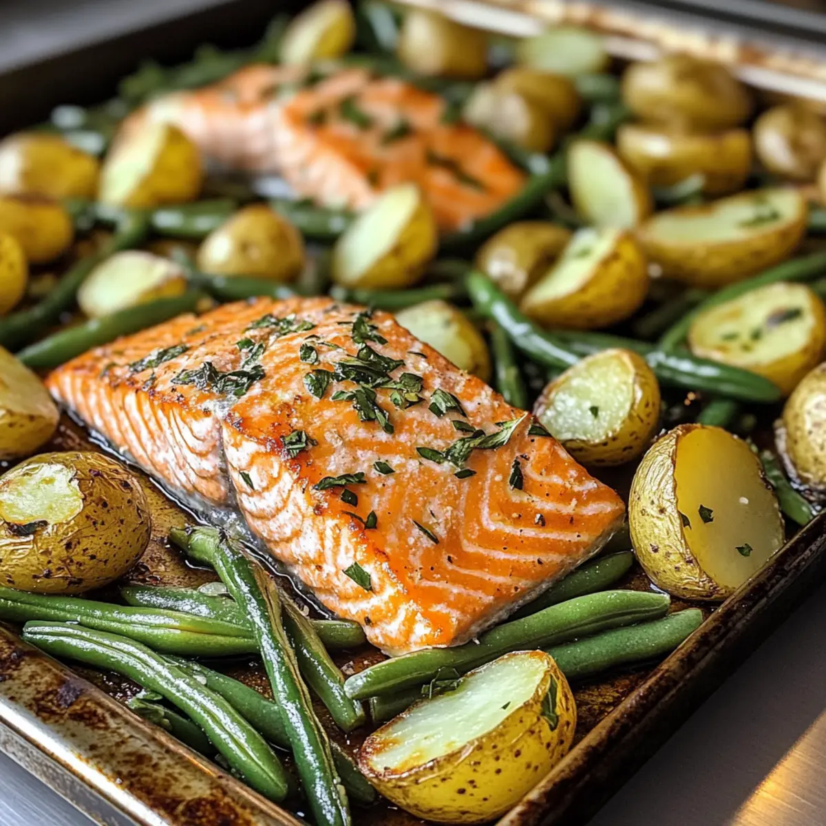 Bedecke ein Backblech mit Backpapier und lege den Lachs in die Mitte. Die vorbereiteten Bohnen und Kartoffeln rund um den Lachs verteilen. Träufle reichlich Olivenöl über die Zutaten und würze sie großzügig mit Salz, Pfeffer und Knoblauchpulver. Achte darauf, dass alles gut mit Gewürzen bedeckt ist, um den Geschmack zu intensivieren.