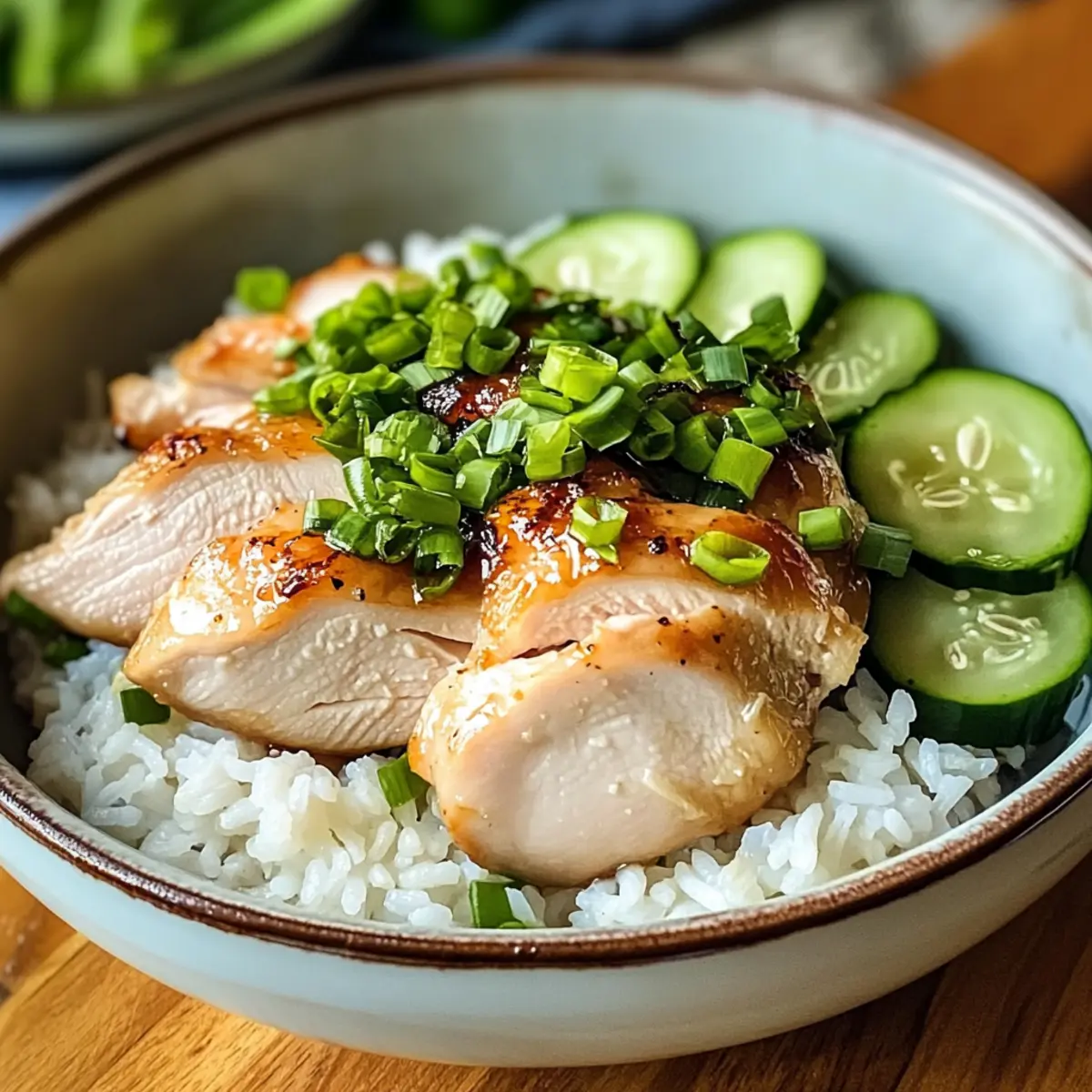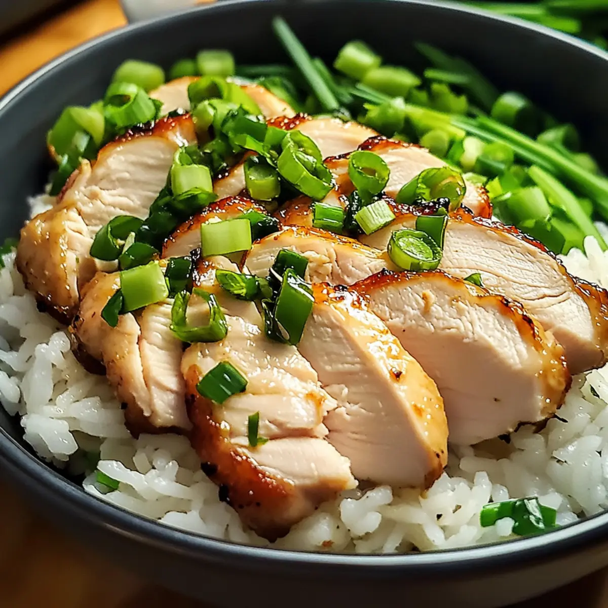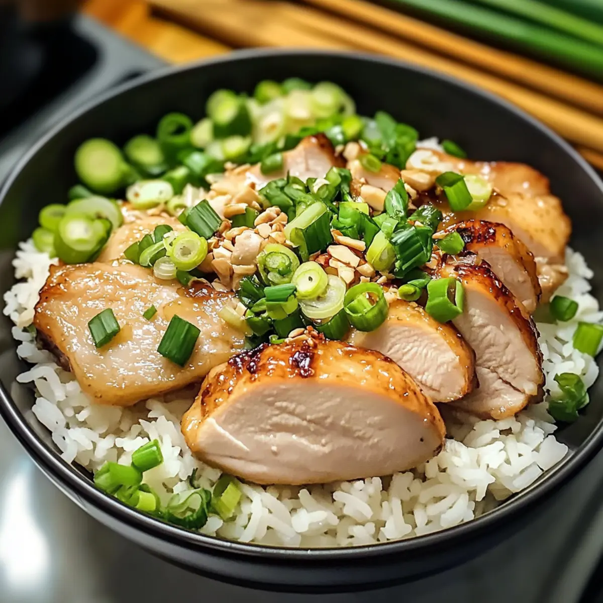 Schneide die Hähnchenkeulen in Scheiben und serviere sie über dem locker fluffigen Reis. Träufle das aromatische Schnittlauchöl darüber für zusätzlichen Geschmack. Optional kannst du das Gericht mit Sojasauce oder Chiliöl für eine scharfe Note anpassen.