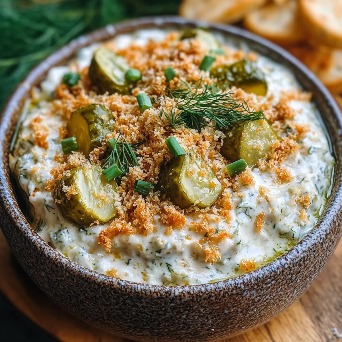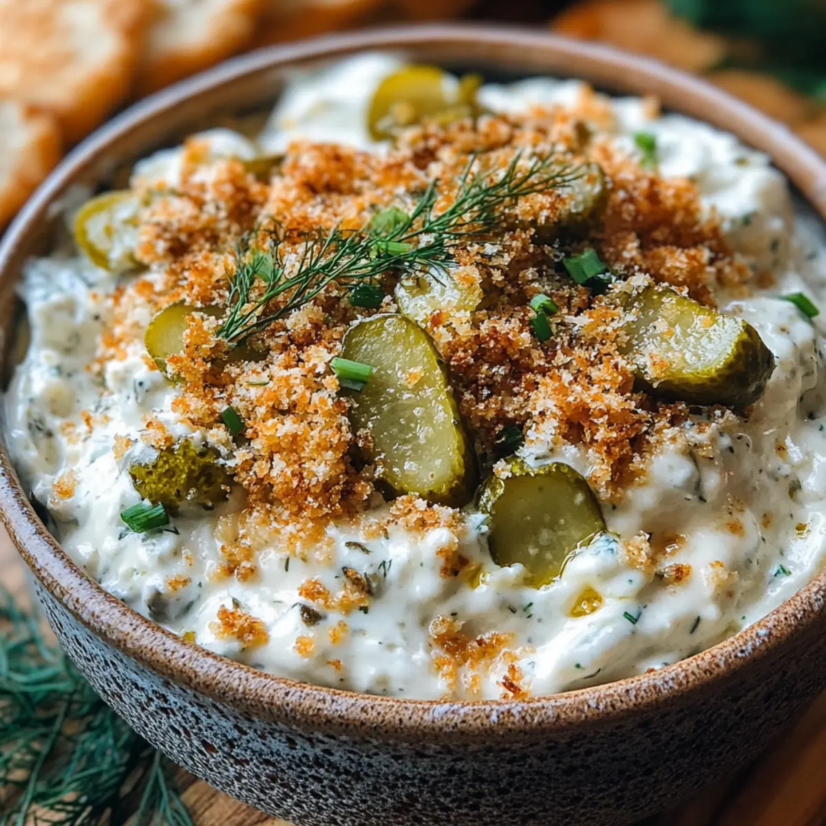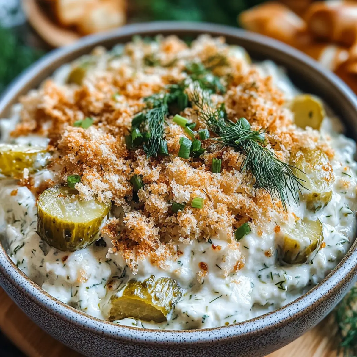 Kurz vor dem Servieren rühre einen Teil der abgekühlten und gerösteten Panko-Brösel unter den Dip für zusätzlichen Crunch. Bestreue die Oberfläche mit der restlichen Panko-Mischung, etwas gehackten Dillgurken und frischem Dill. Serviere deinen Dip zusammen mit knusprigen Kartoffelchips, Gemüsesticks oder Crostini, um das Geschmackserlebnis zu genießen!
