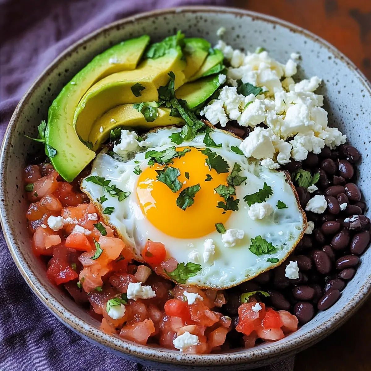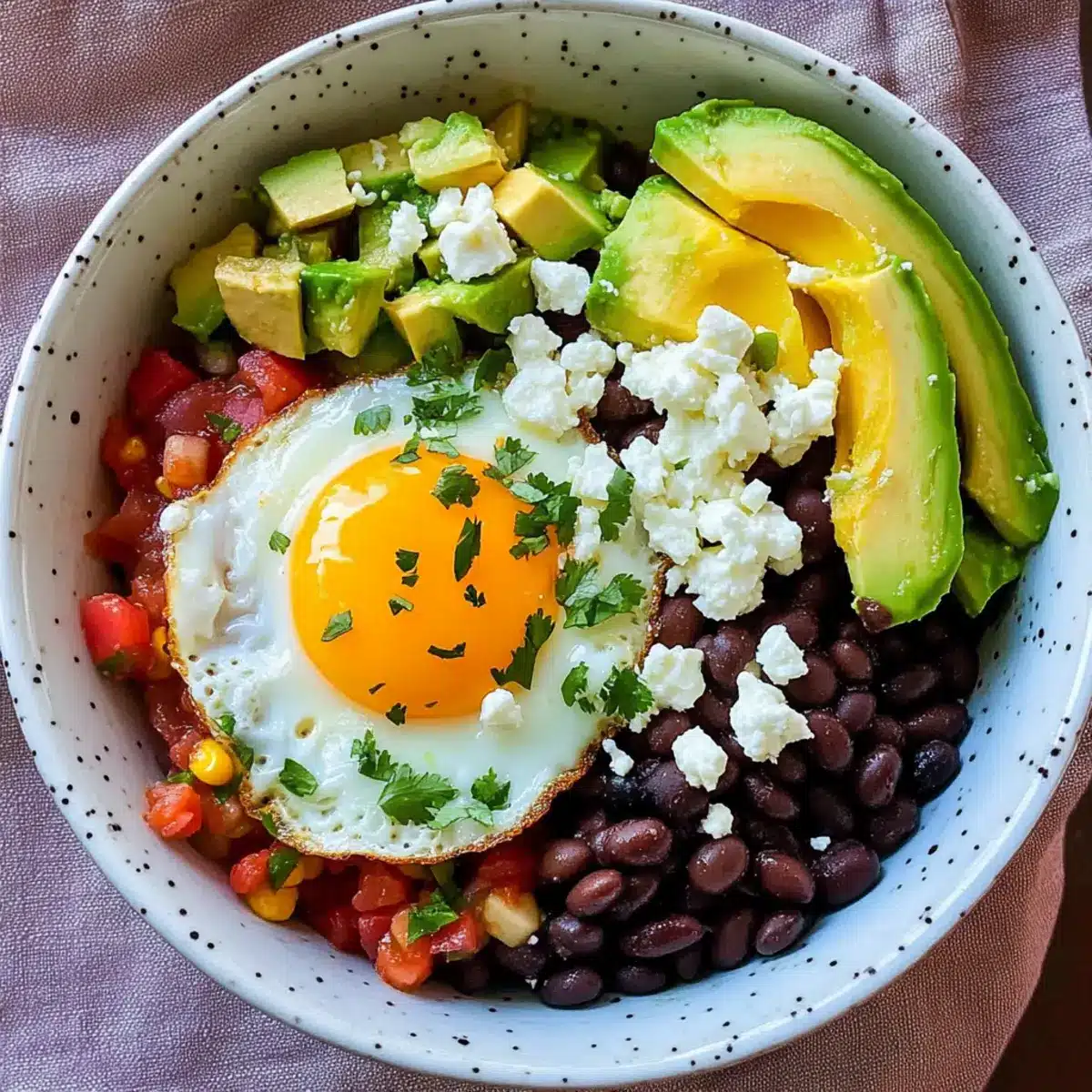 Platziere vorsichtig das über-easy Ei auf den Bohnen. Ergänze die Schale mit frischen Avocadoscheiben, einem Löffel Salsa oder Pico de Gallo und einer großzügigen Portion Cojita oder Feta-Käse. Jeder Belag bringt eigene Textur und immer neue Aromen in die Frühstücksburrito-Schalen.