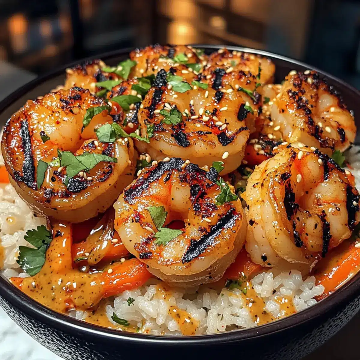 Die fertigen Gegrillte Garnelen-Reisbowl mit frischem Koriander, Sesamsamen und Limettenspalten garnieren. Die Limettenspalten dürfen nicht fehlen, da ihr Saft das Gericht noch weiter aufpeppt. Sofort servieren und genießen – so bringt ihr Freude auf den Tisch!