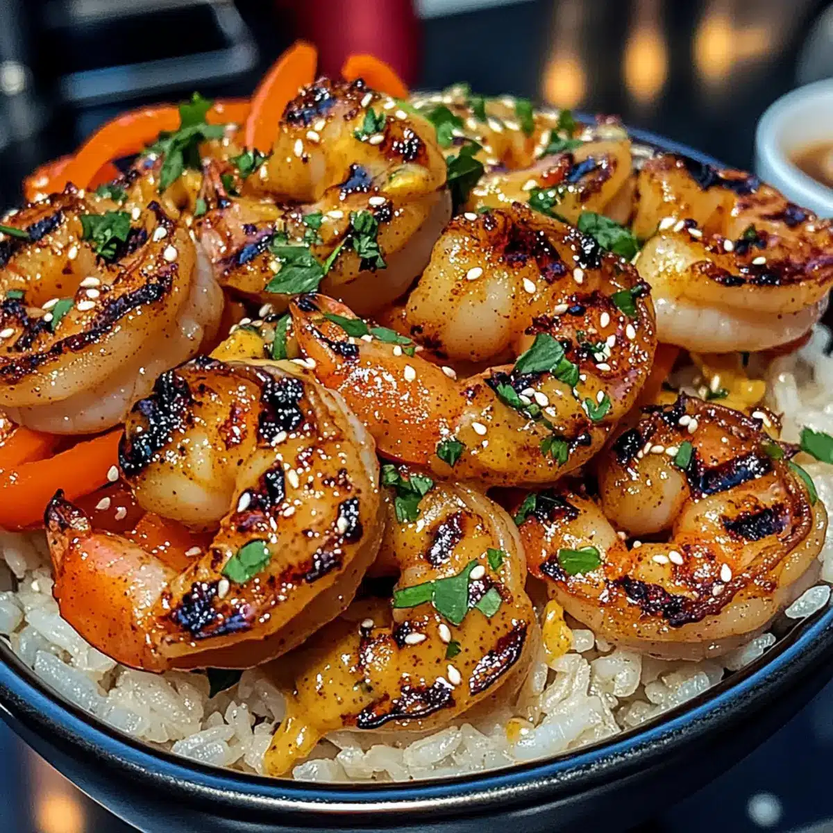 Gegrillte Garnelen-Reisbowl mit süß-scharfer Limetten-Sauce