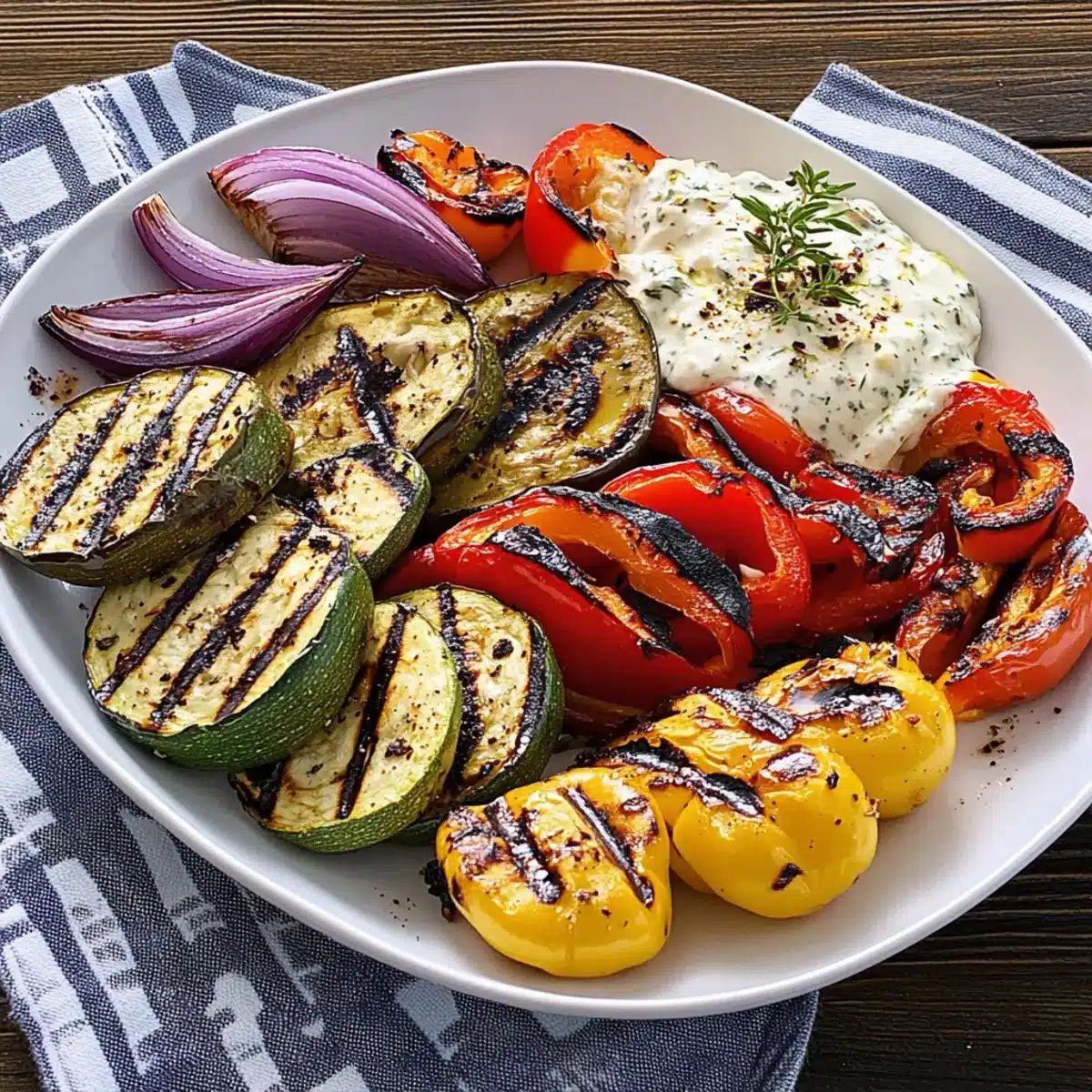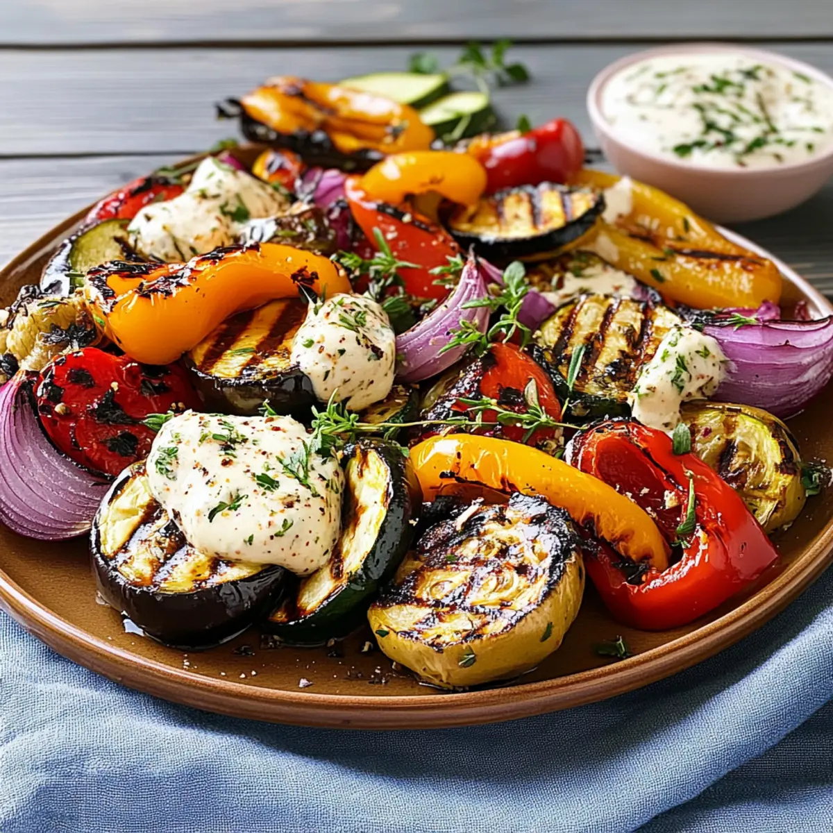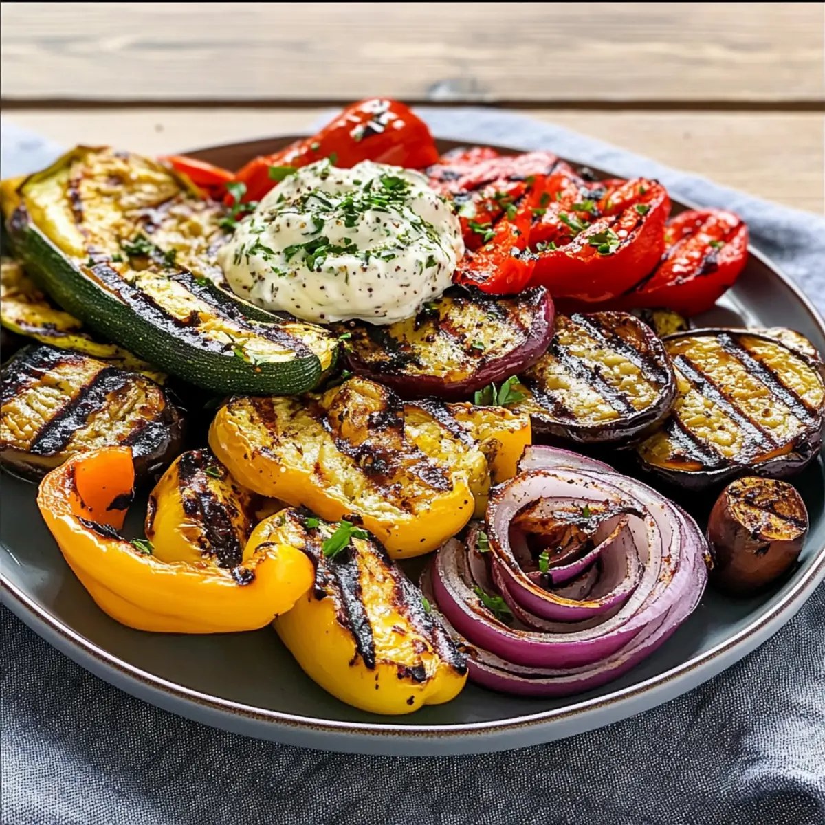 Mit einem bunten Arrangement von gegrilltem Gemüse und einem cremigen Dip kreierst du das perfekte Festmahl!