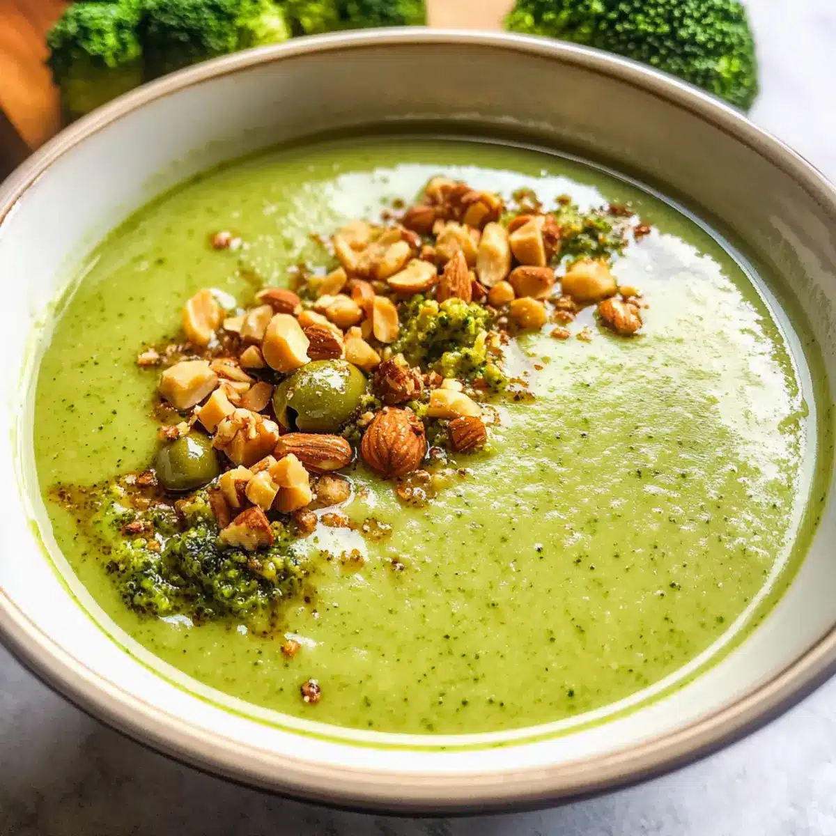 Gesunde Brokkoli-Suppe mit Nuss- und Olivenpesto