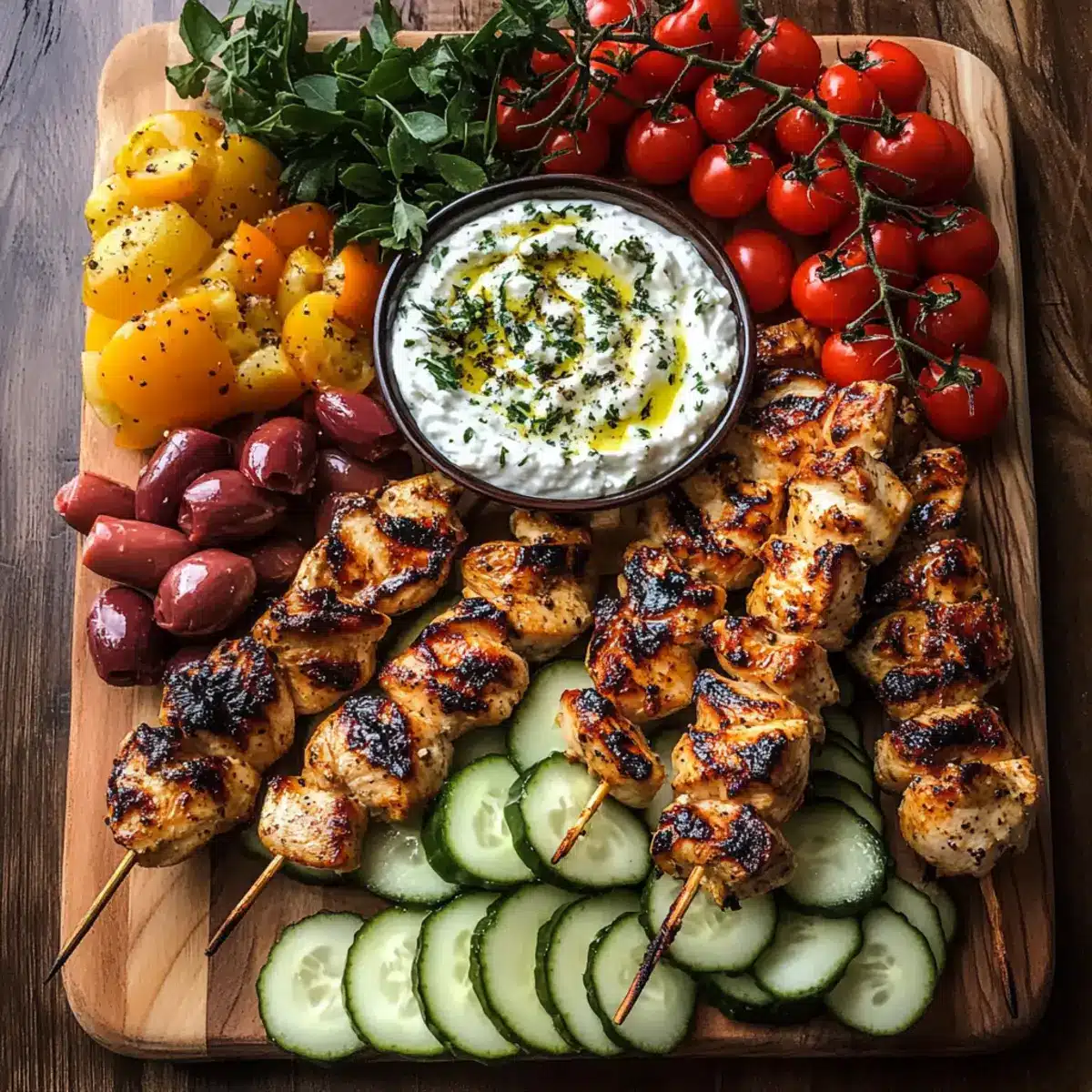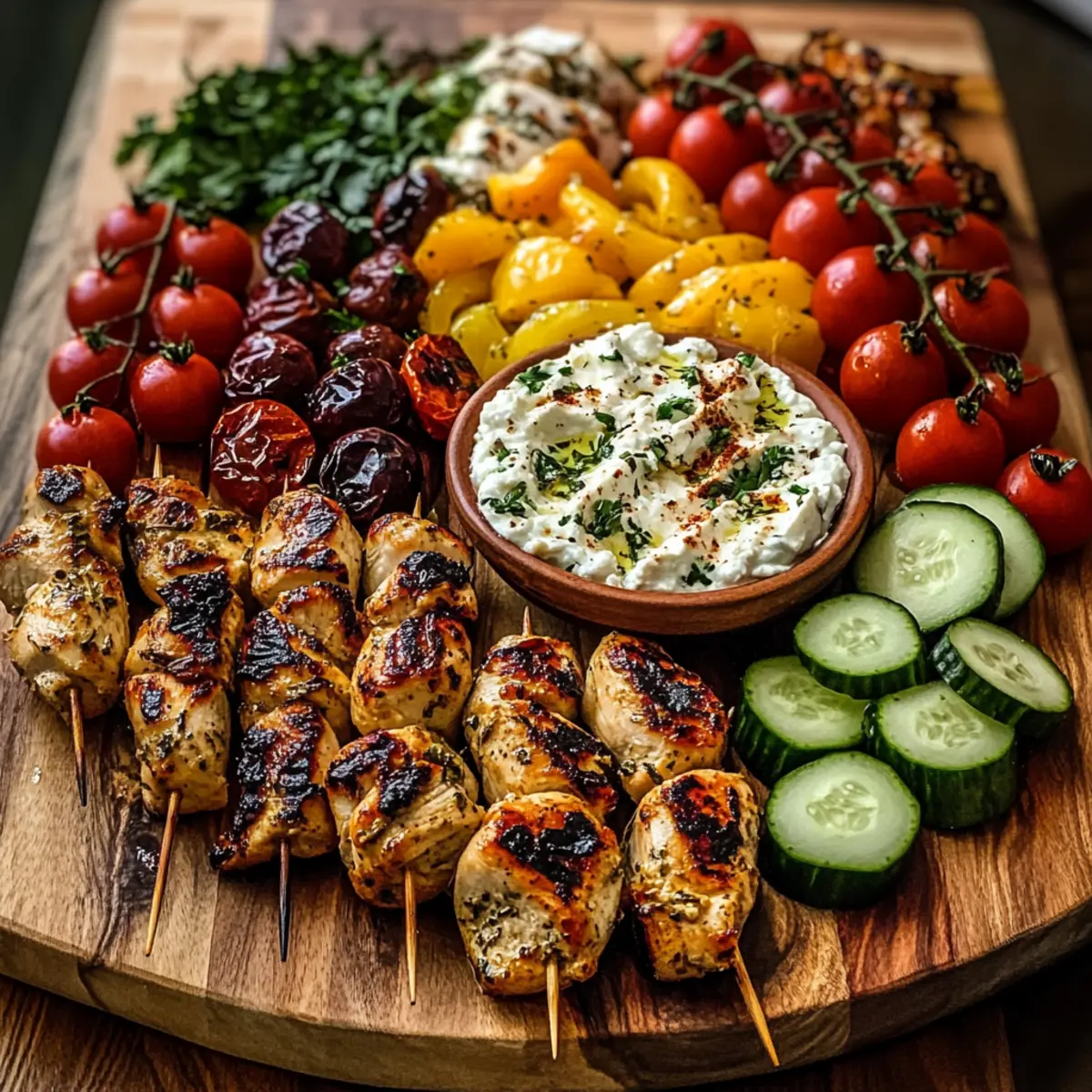 Griechisches Hähnchen Souvlaki Schlemmerplatte mit Feta-Dip