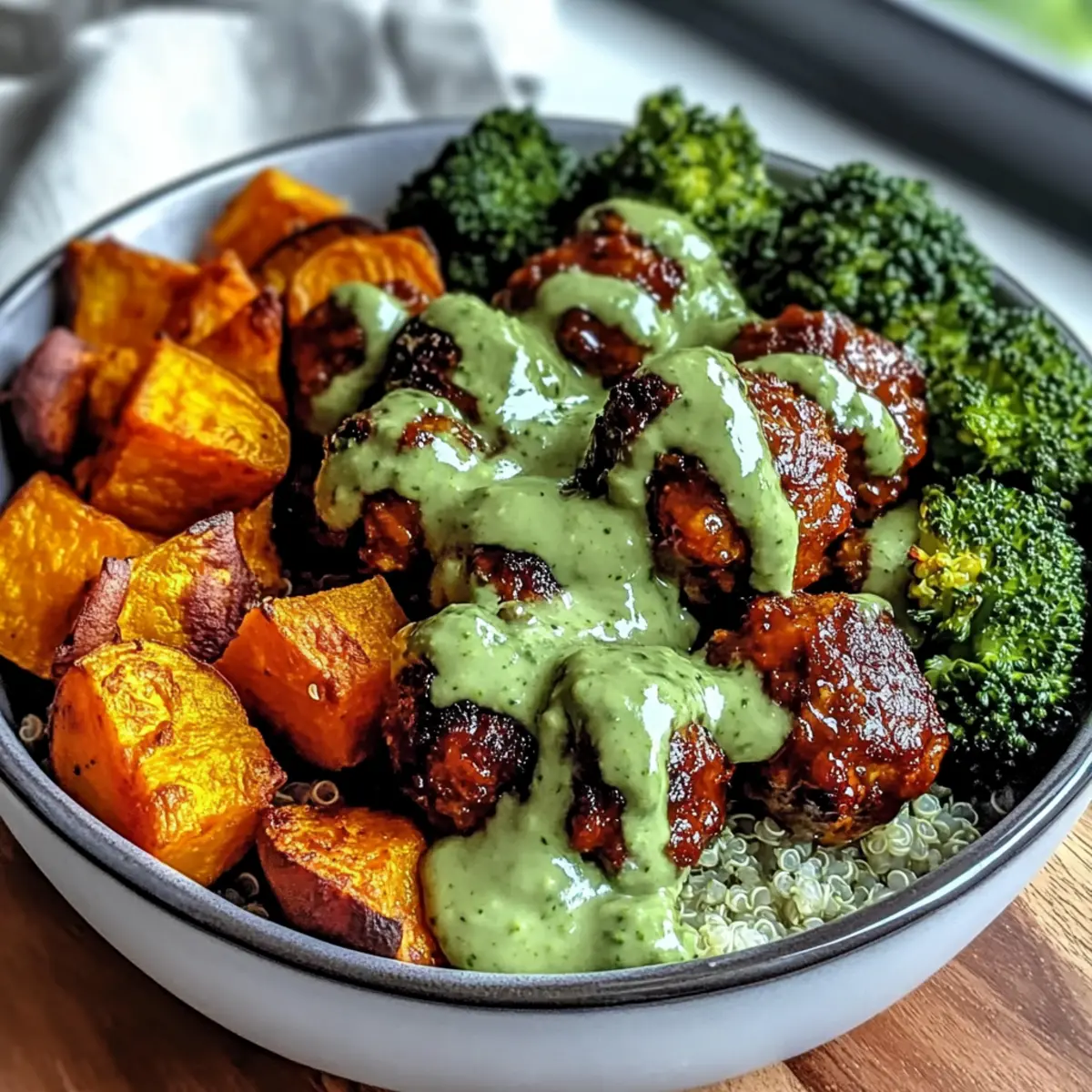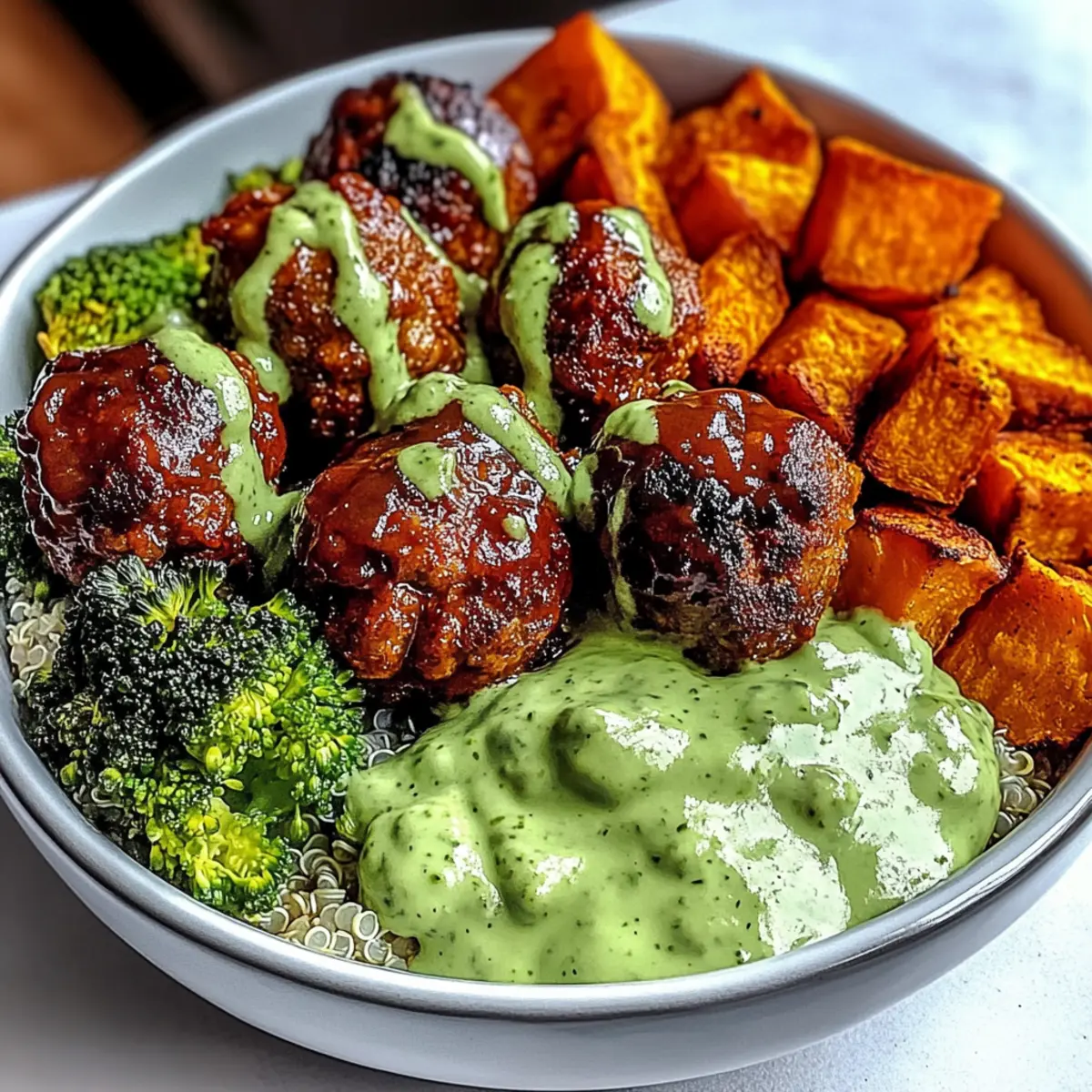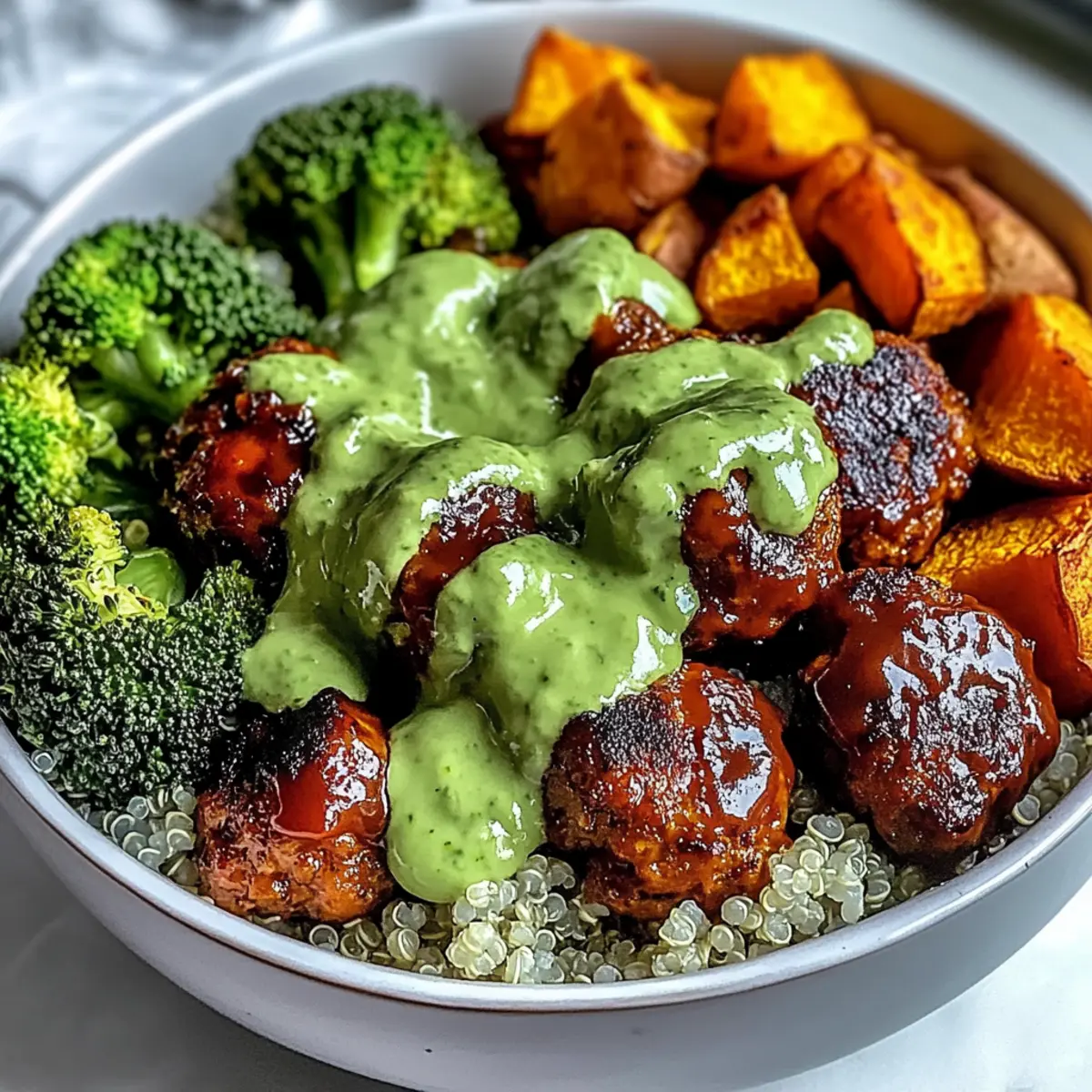 - Um die Schalen zusammenzustellen, beginne mit einer Schicht Quinoa, füge die gerösteten Süßkartoffeln und den Brokkoli hinzu und lege die gebackenen Fleischbällchen darauf. Gib die Avocado-Soße darüber und serviere sofort.