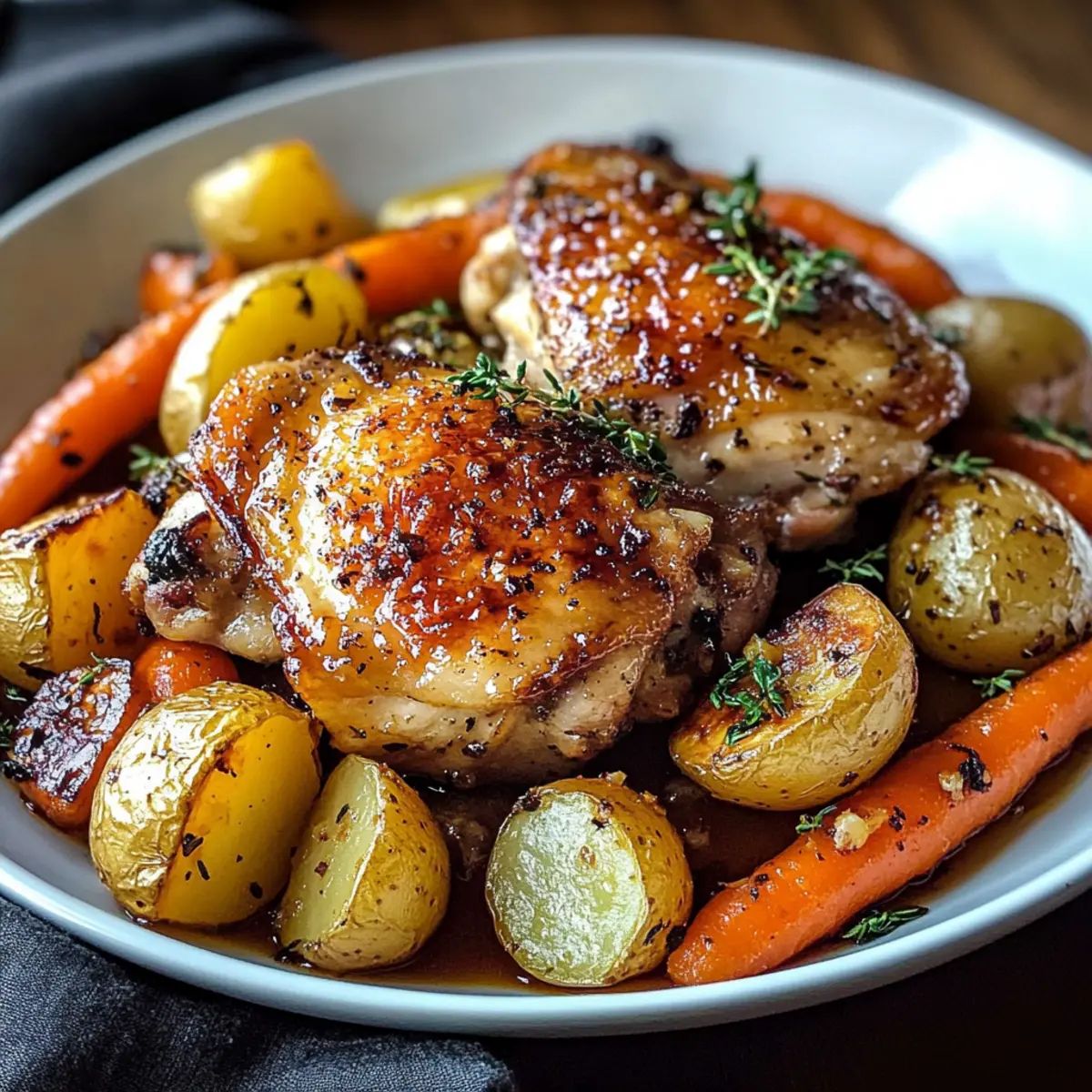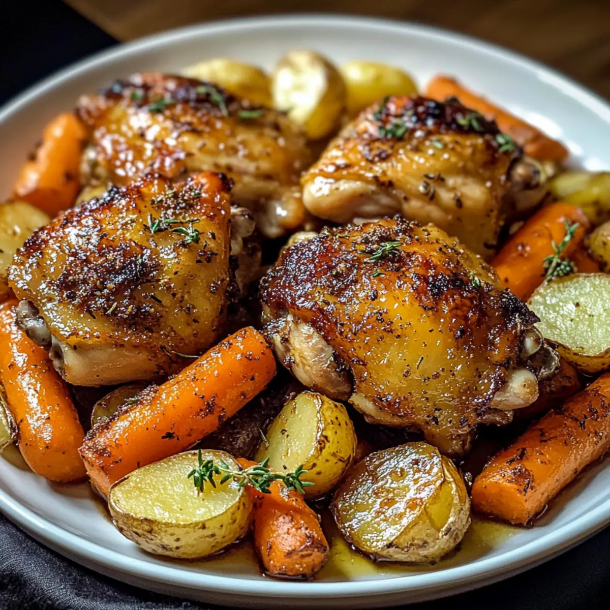 Genuss: Die knusprigen Hähnchenoberkeulen, kombiniert mit süßen Karotten und zarten Kartoffeln, liefern ein unschlagbares Geschmackserlebnis.