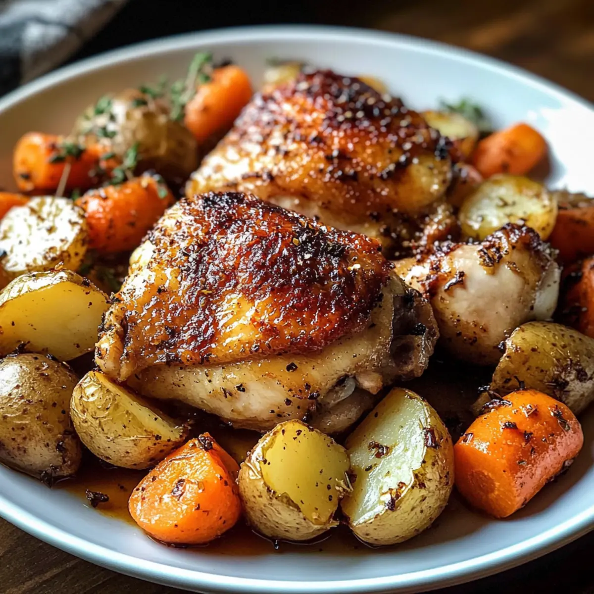 Lassen Sie die Hähnchenoberkeulen mit Karotten und Kartoffeln für fünf Minuten ruhen, bevor Sie sie servieren. Dies hilft, die Säfte im Fleisch zu halten, was zu einem saftigeren Biss führt. Nutzen Sie die Zeit, um Ihre Beilagen vorzubereiten oder den Tisch zu decken.