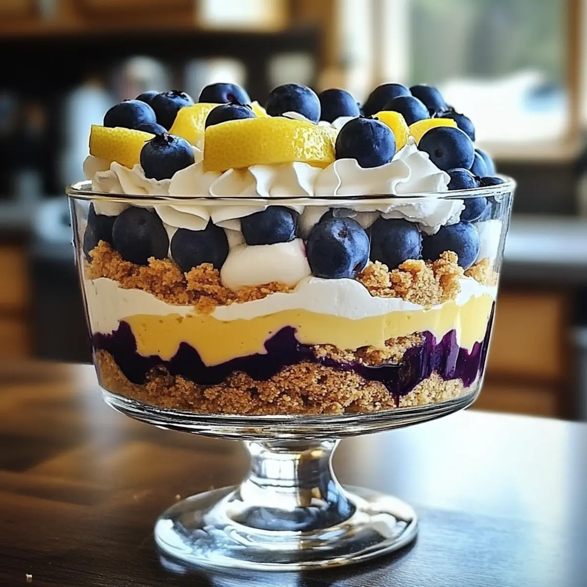 - Verteile die restliche Schlagsahne auf der obersten Schicht und garniere sie mit Heidelbeeren und Zitronenscheiben. Decke die Gläser ab und stelle sie für mindestens 4 Stunden in den Kühlschrank.