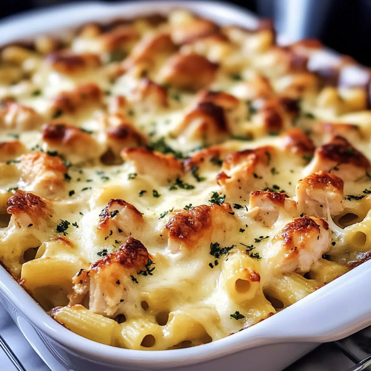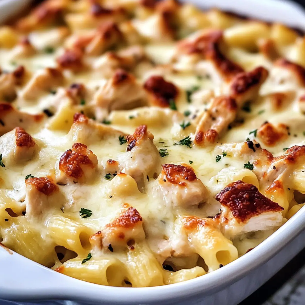 Cremiger Genuss: Die Kombination aus Sahnesauce, zartem Hühnchen und geschmolzenem Käse bietet ein unvergleichliches Geschmackserlebnis—ein wahrer Genuss!