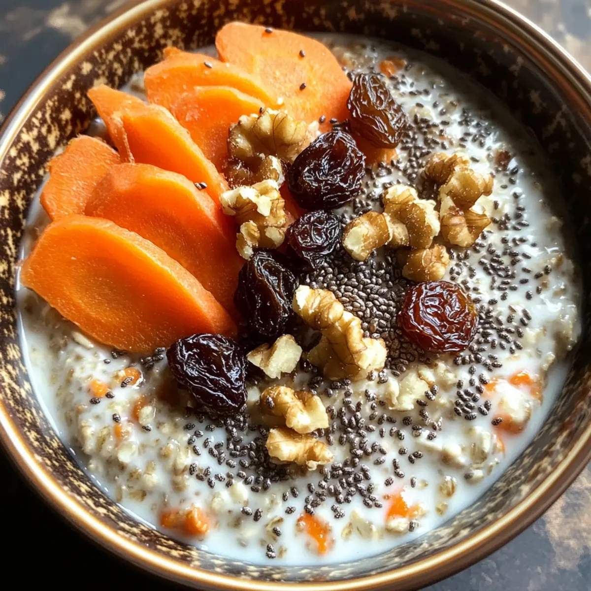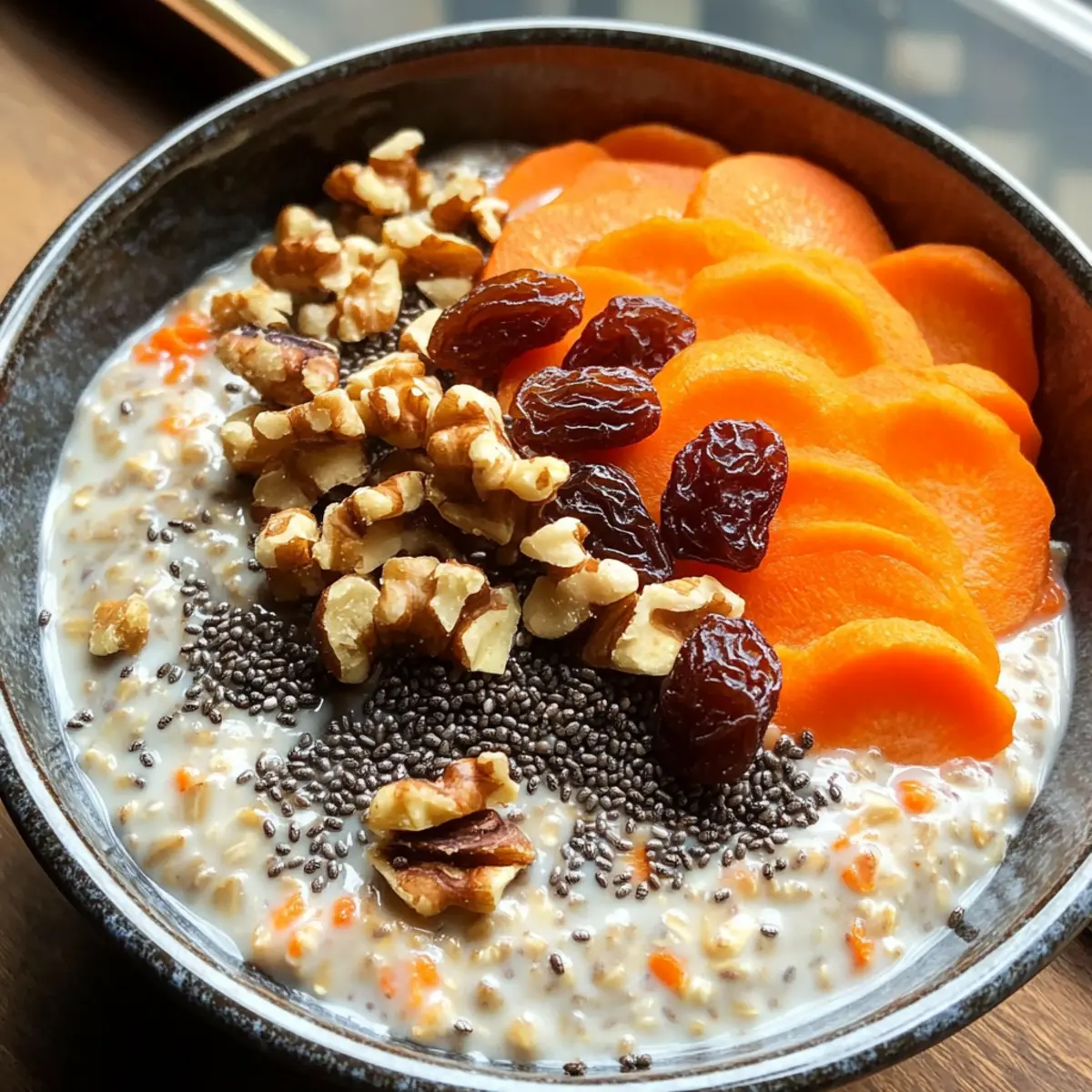 Bevor du die Karottenkuchen Chia Hafer servierst, nimm die Schüssel aus dem Kühlschrank und rühre sie sorgfältig um. Füge nach Belieben Rosinen und Walnüsse hinzu, um eine angenehme Textur zu erreichen. Wenn die Mischung zu dick ist, kannst du ein wenig zusätzliche Mandelmilch einrühren, um die gewünschte Konsistenz zu erzielen.