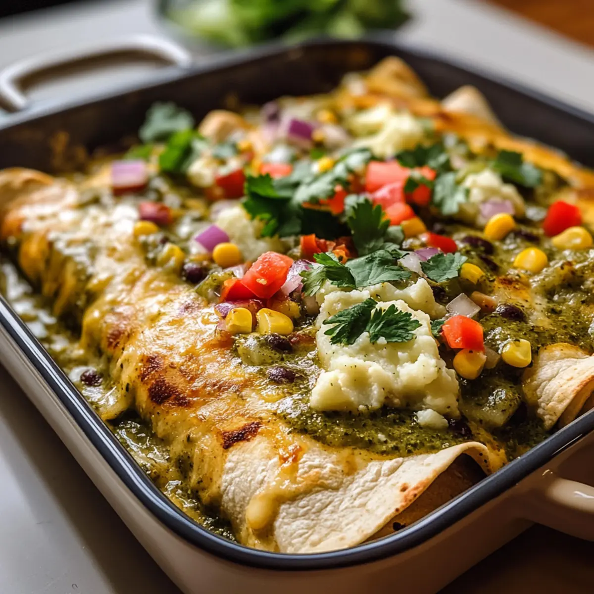 Gieße die restliche grüne Chili-Sauce gleichmäßig über die eingerollten Enchiladas. Decke die Auflaufform mit Alufolie ab, damit die Enchiladas nicht austrocknen. Backe sie für 20 bis 25 Minuten im vorgeheizten Ofen, bis sie heiß und sprudelnd sind.