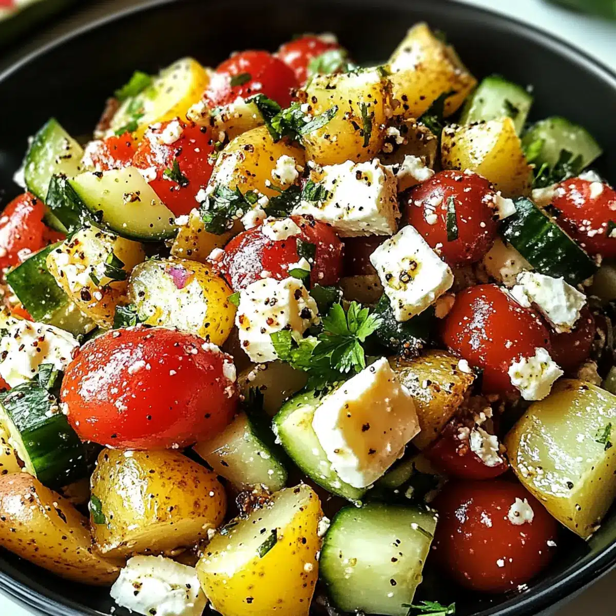 In einer großen Schüssel kombinierst du die Kartoffelwürfel mit der fein gehackten Petersilie, den rohen Zwiebeln, der gewürfelten Gurke, den klein geschnittenen Tomaten, den schwarzen Oliven und dem zerbröckelten Feta. Rühre alles vorsichtig um, damit die Zutaten gut vermischt werden und die Texturen erhalten bleiben.
