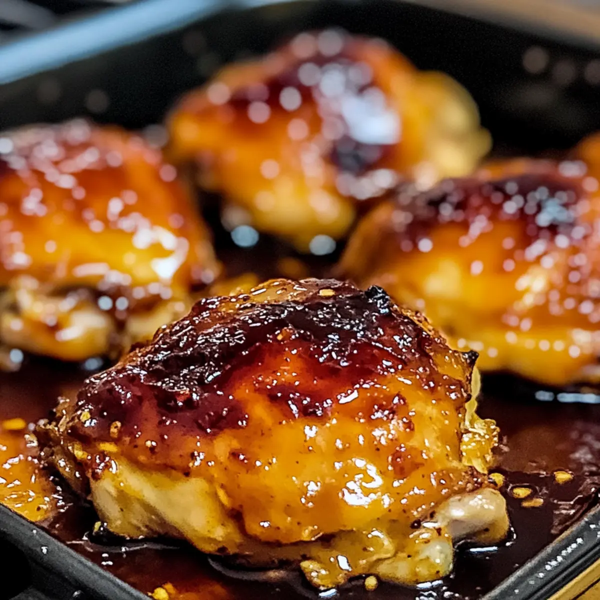 - Wende die Hühnchenschenkel vorsichtig und löffele die reservierte Sauce gleichmäßig über die Stücke, backe sie weitere 25-30 Minuten.