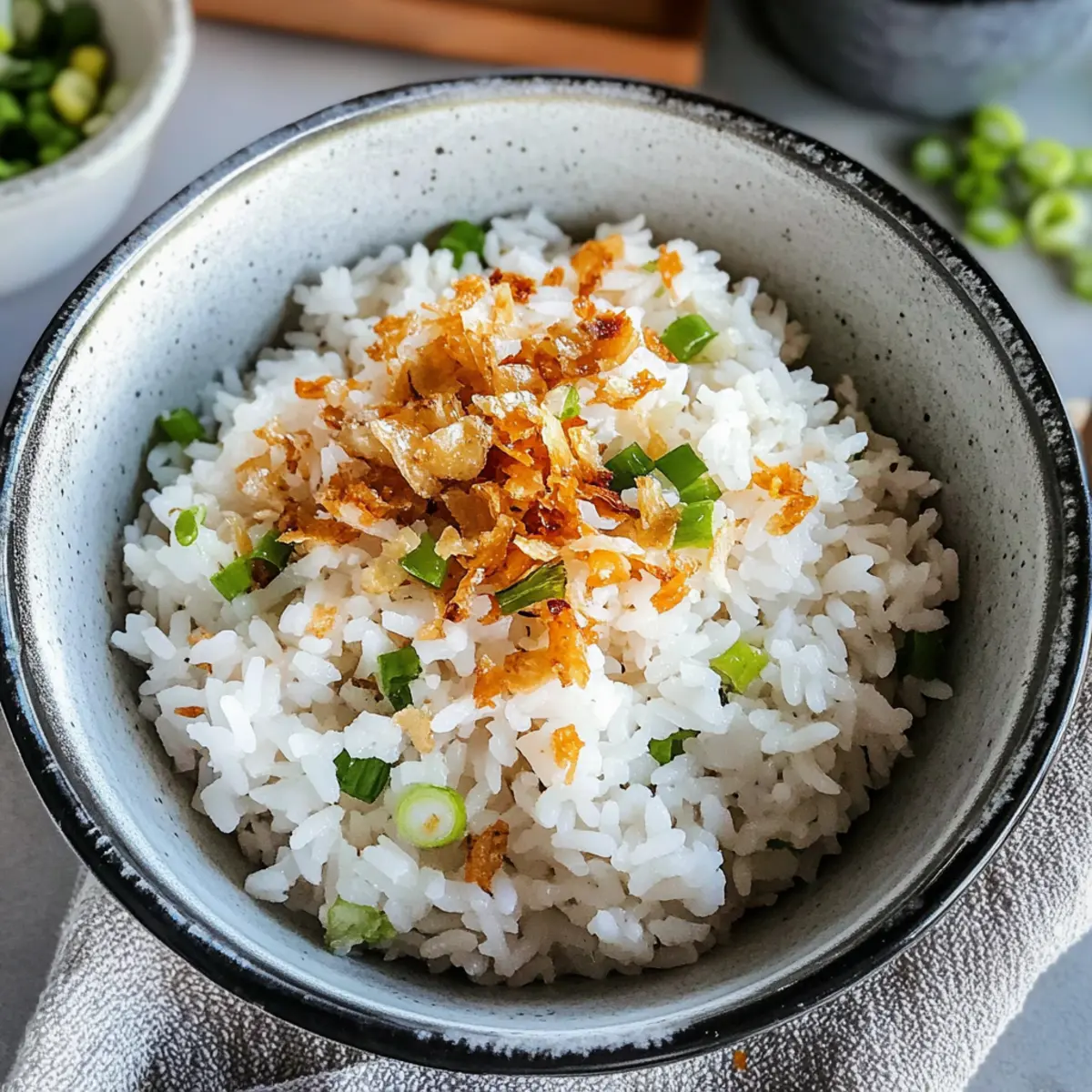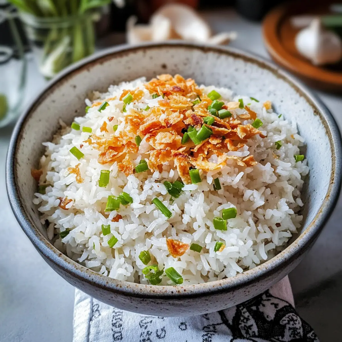 Serviere deinen köstlichen Knoblauchreis sofort in einer Schüssel. Achte darauf, dass die goldenen Knoblauchstücke gleichmäßig verteilt sind, um ein optimales Geschmackserlebnis zu gewährleisten. Genieß ihn als herzhaftes Frühstück oder als Beilage zu deinem Lieblingsgericht.