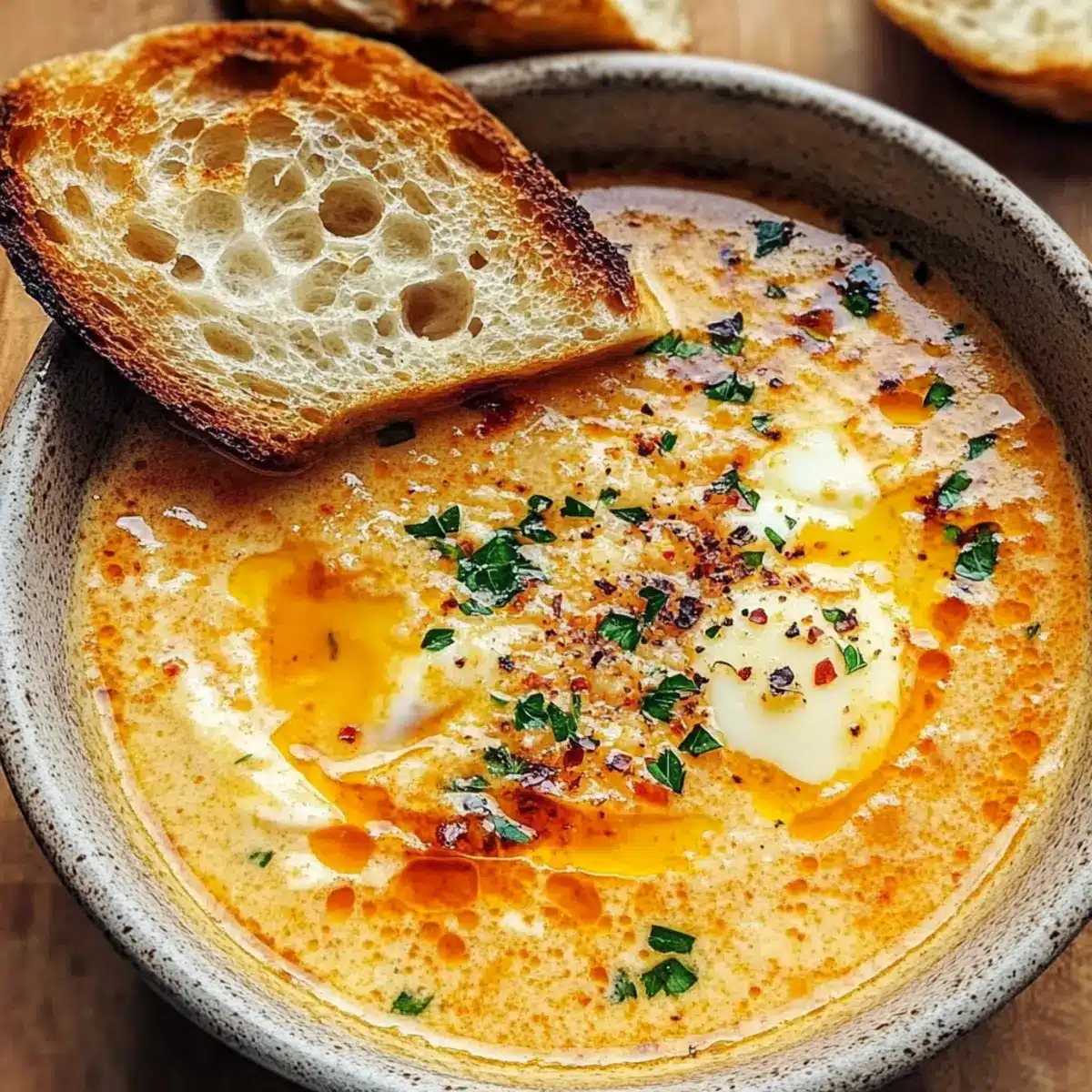 Überbackener Käse: Ein Stück geschmolzener Käse auf dem Brot bietet eine cremige und reichhaltige Komponente, die die Suppe perfekt ergänzt.