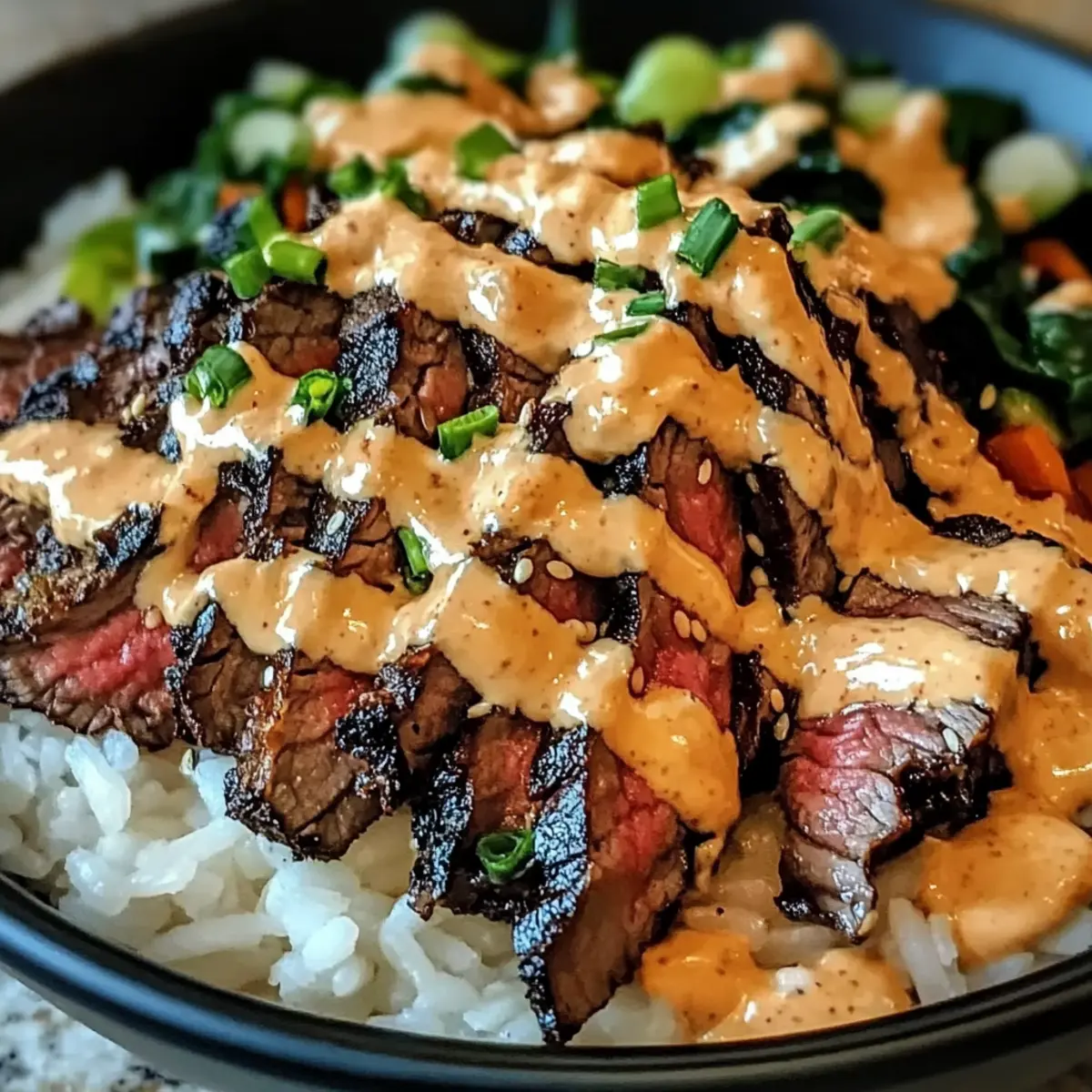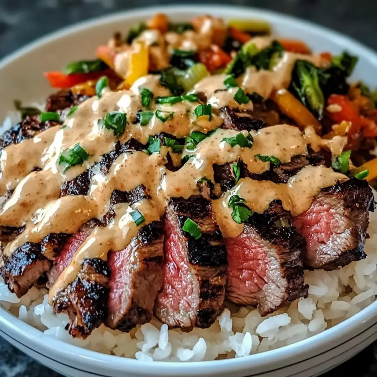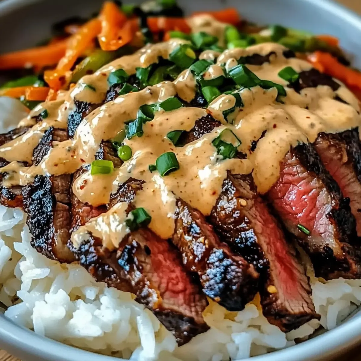 Koreanisches BBQ Steak Reis Schalen mit Sahnesauce