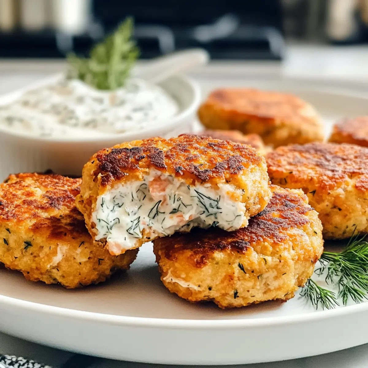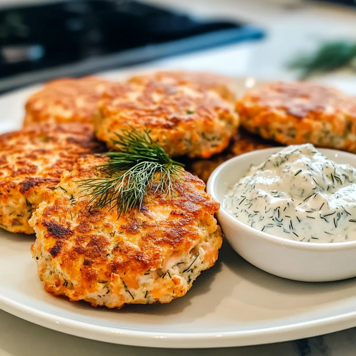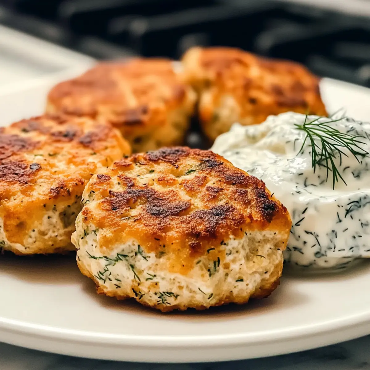 - Lege die frisch gebratenen Lachsbratlinge auf einen Teller und serviere sie warm mit einem großzügigen Löffel der würzigen Dill-Knoblauch-Dip.