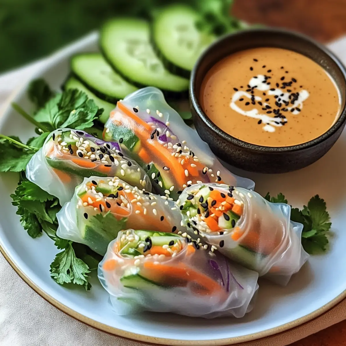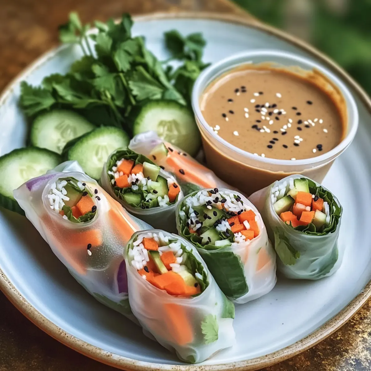 - Servieren: Serviere die Sommerrollen frisch auf einem schönen Teller und platziere den Erdnussdip in der Mitte.