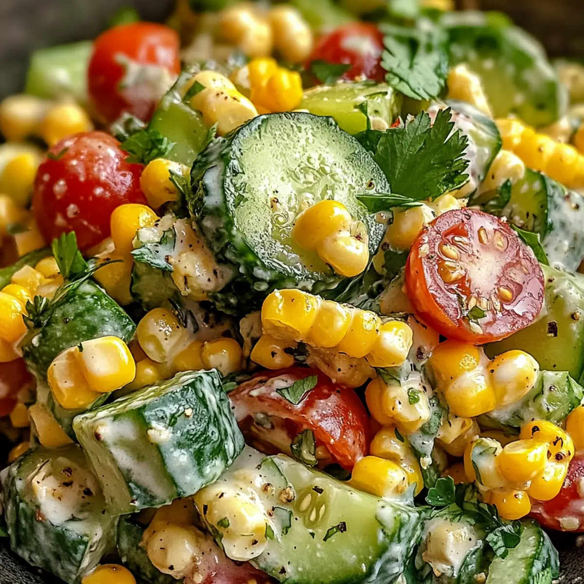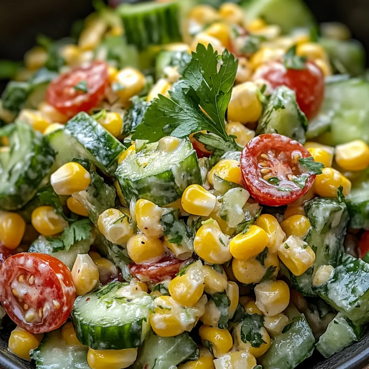 Veganer Genuss: Ersetze die Mayonnaise und den Sauerrahm durch pflanzliche Alternativen, um eine vegane Version des Mais cremigen Gurkensalats zu kreieren.