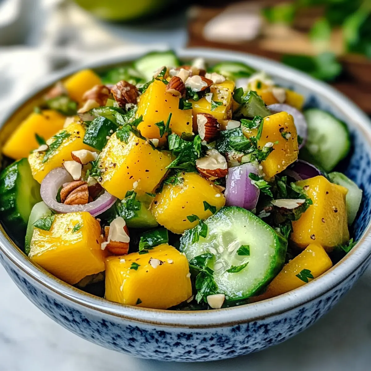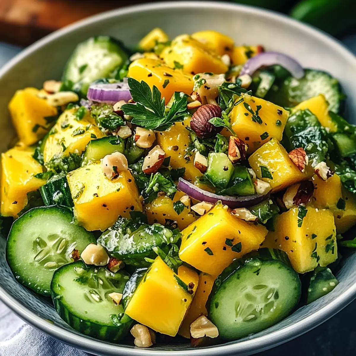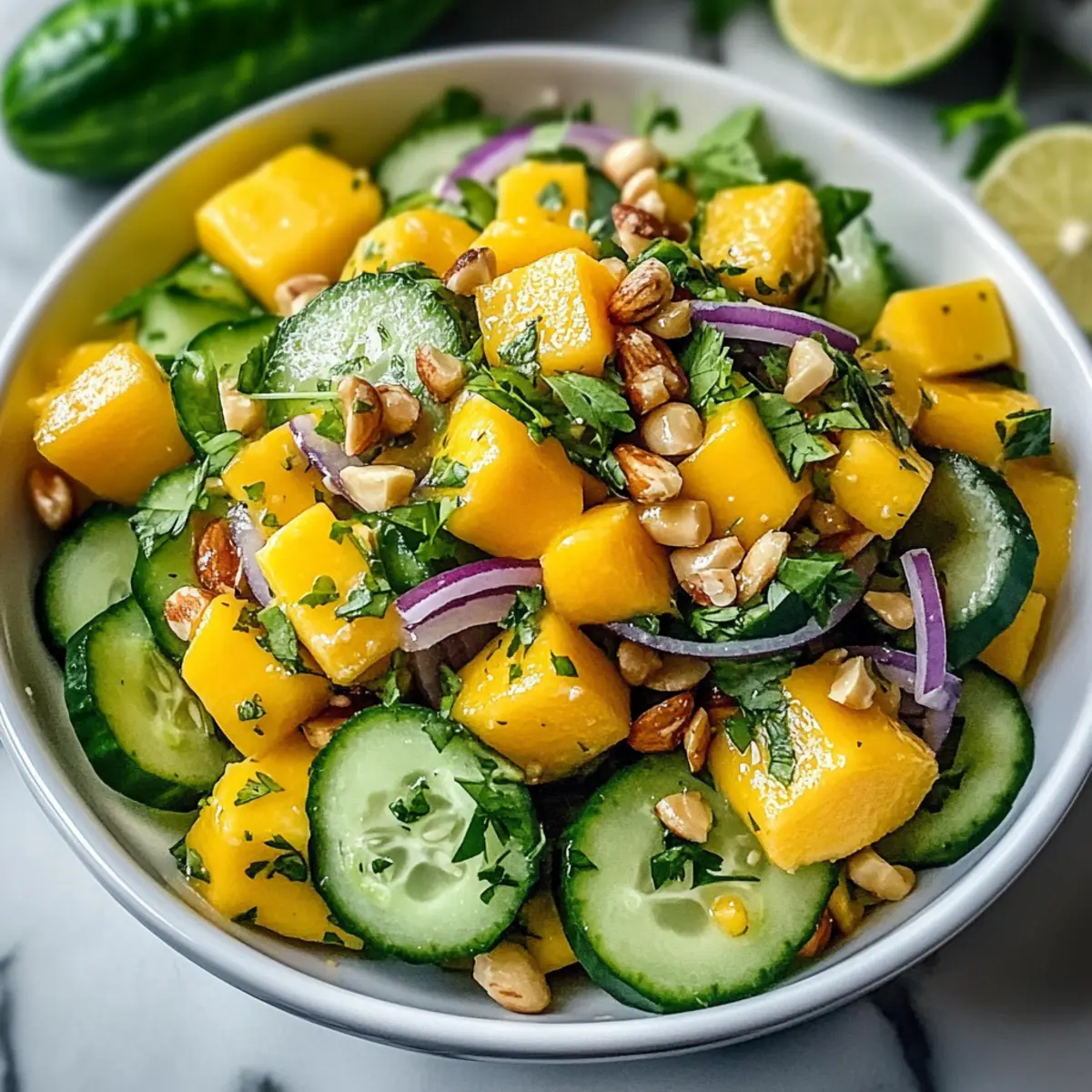 Entdecke die frischen Aromen und die bunte Vielfalt, die dieser Mango Gurken Salat bietet!