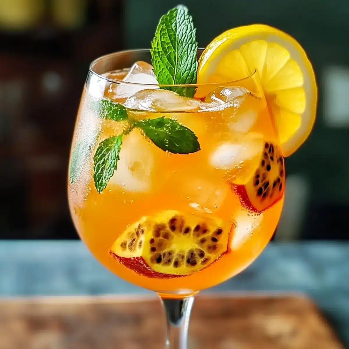 - Lege eine Scheibe Zitrone auf den Rand des Glases und füge die Hälfte einer Passionfruit hinzu.