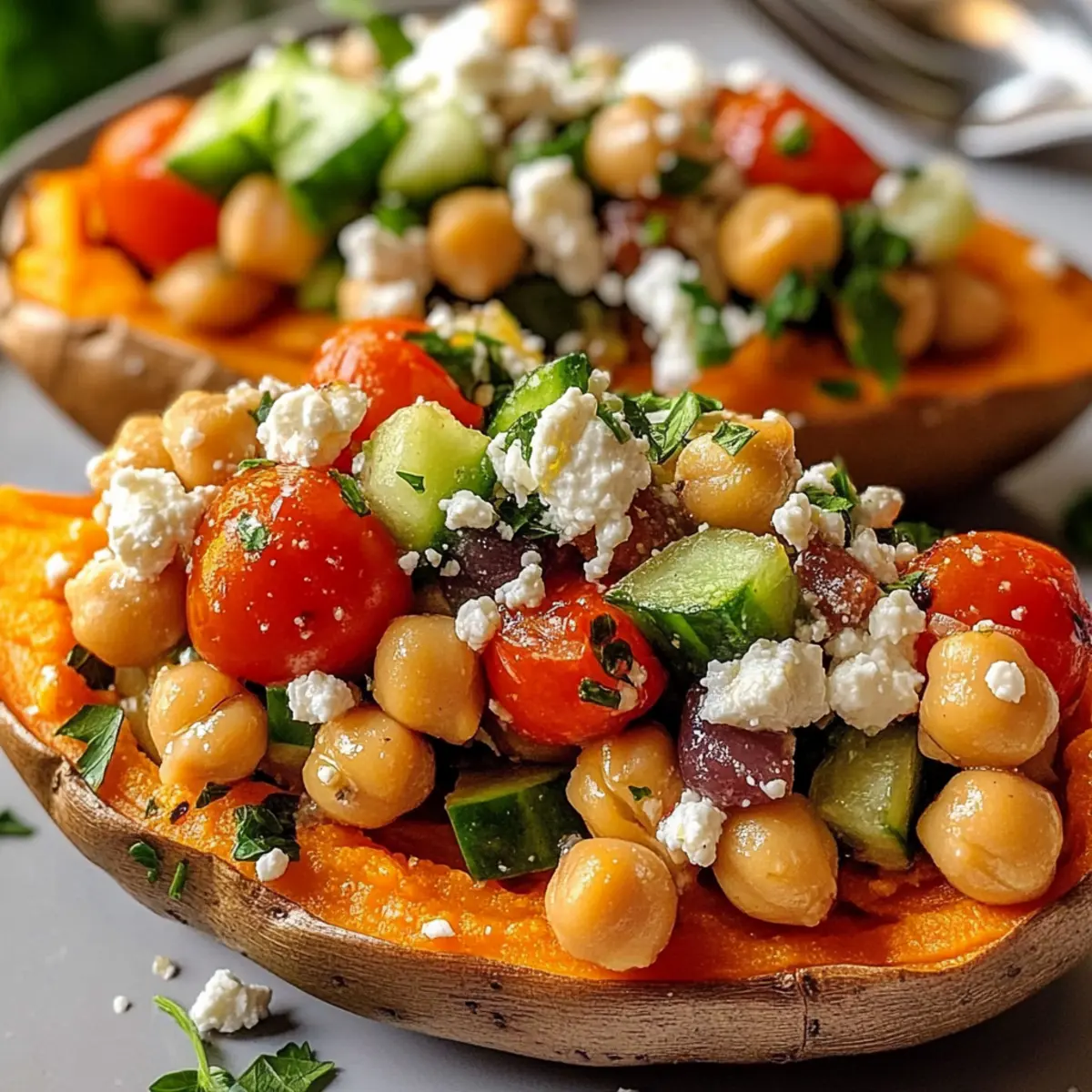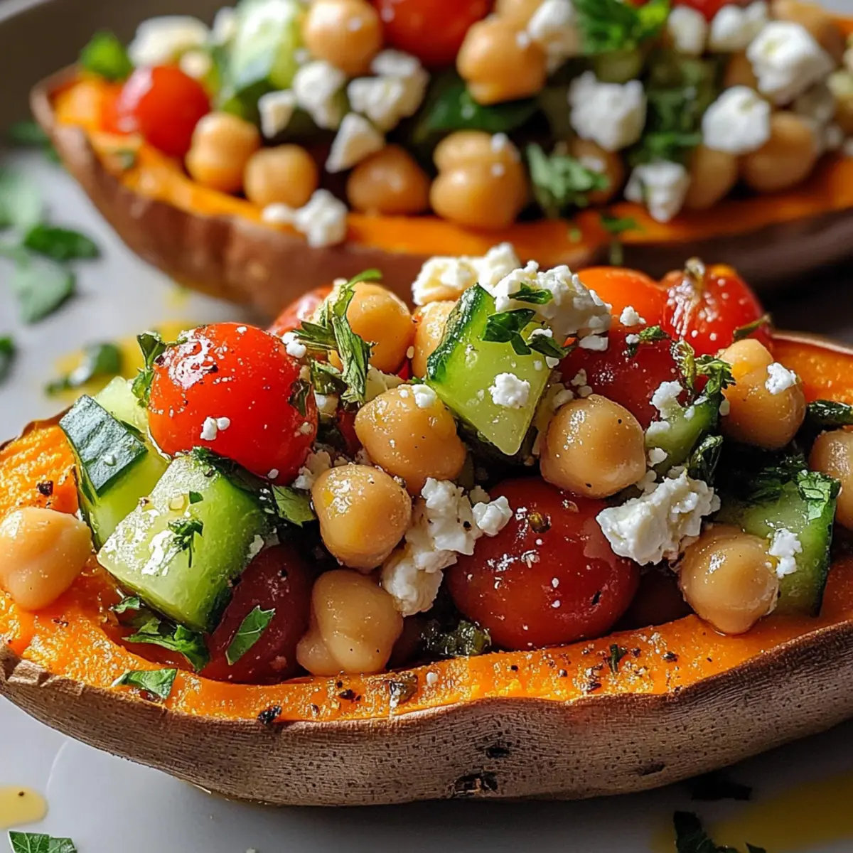 Während die Süßkartoffeln im Ofen sind, bereite die Füllung vor. In einer großen Schüssel kombinierst du Kichererbsen, Kirschtomaten, Gurke, rote Zwiebel, Kalamata-Oliven, Feta sowie frisch gehackte Petersilie und Minze. Diese Mischung sollte bunt und ansprechend sein – ein Hinweis auf die mediterranen Aromen der gefüllten Süßkartoffeln.