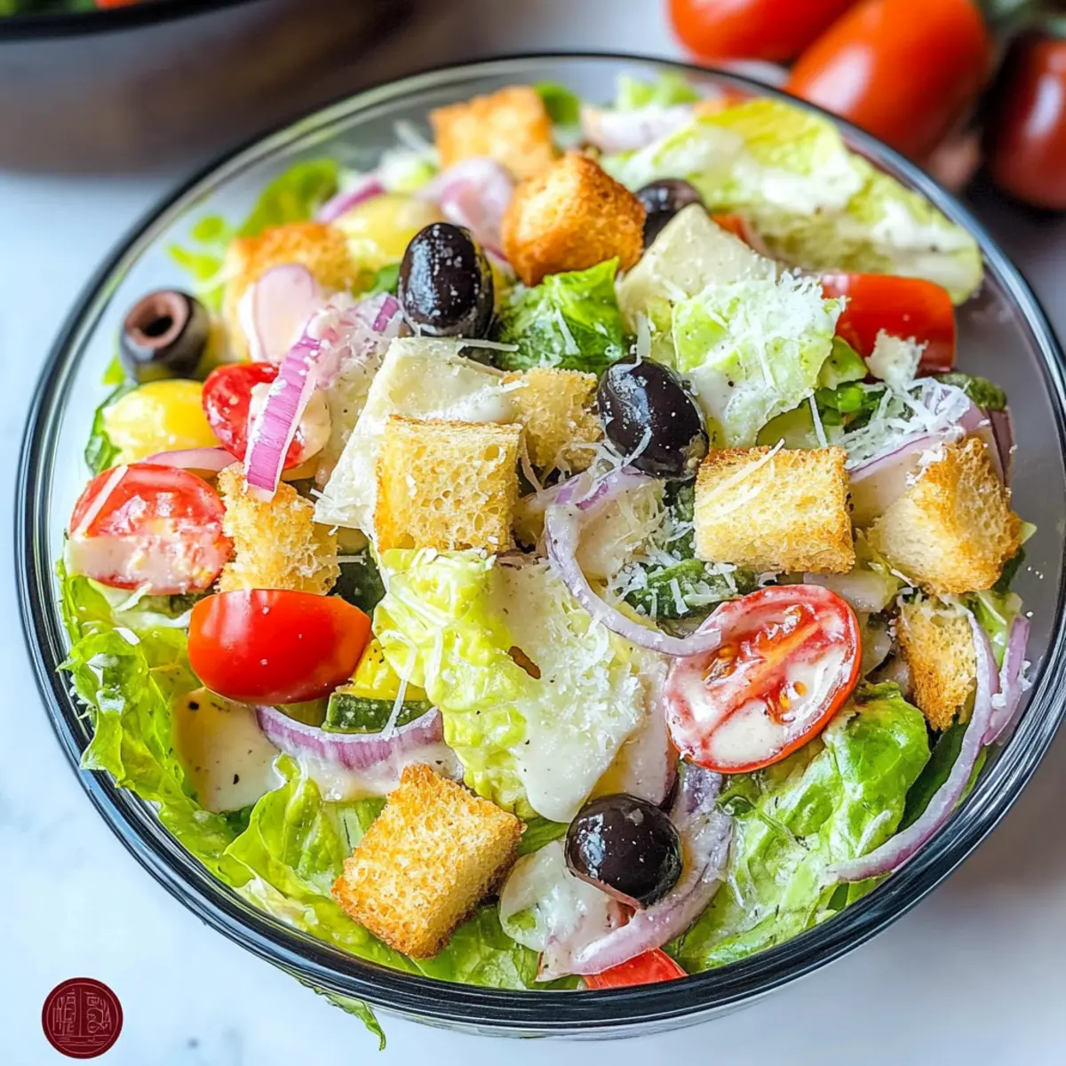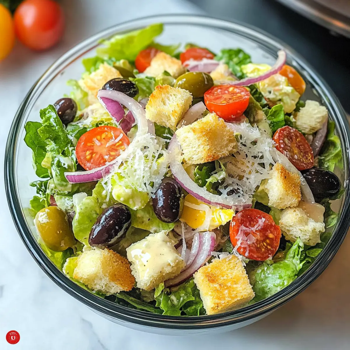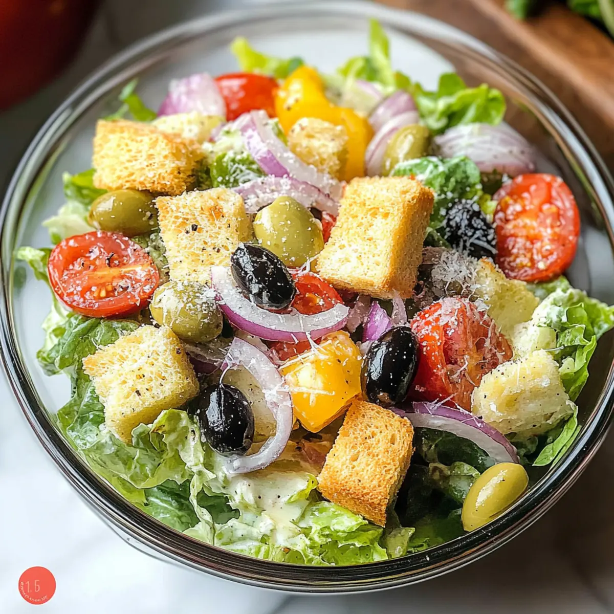 In einer großen Schüssel kombinieren Sie den amerikanischen Salatmix, die Pepperoncini-Paprika, die vorbereiteten Tomatenscheiben, die Zwiebelringe, die Oliven, die Croutons und den geriebenen Parmesan. Achten Sie darauf, dass die Mischung farbenfroh und appetitlich aussieht. Lassen Sie die Zutaten etwa 5 Minuten ruhen, damit sie ihre Aromen entfalten können.