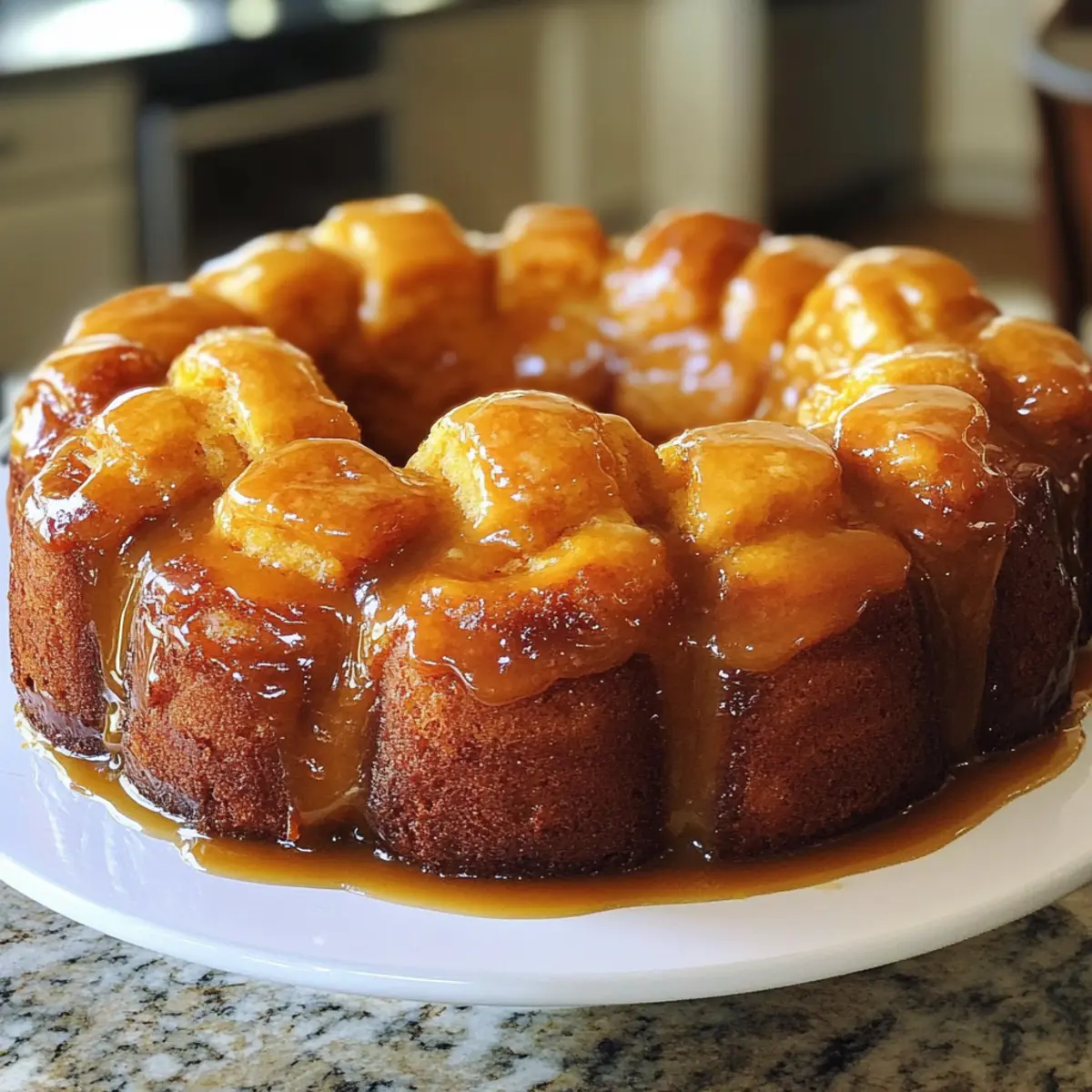 Gieß die warme Glasur gleichmäßig über die Schichten der Teigstücke in der Bundtform. Stelle sicher, dass jede Ecke gut abgedeckt ist, damit der gesamte Orangenaffenkuchen von der köstlichen Zitrusglasur profitiert. Dies wird entscheidend zum Geschmack und zur Feuchtigkeit des Kuchens beitragen.