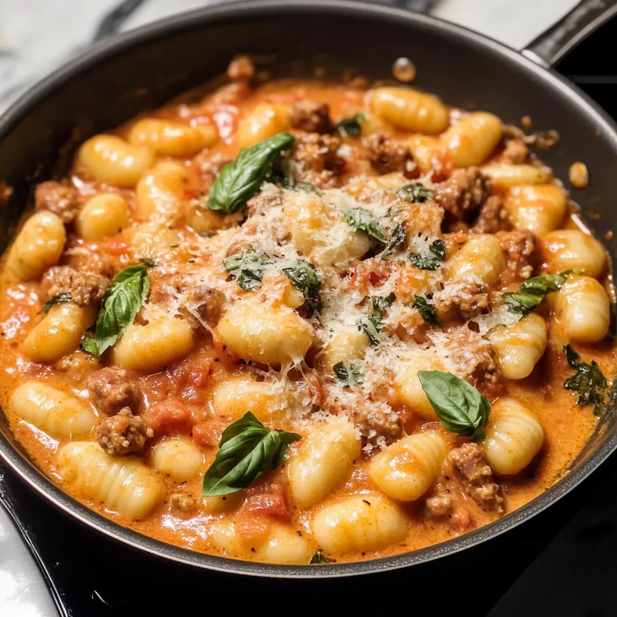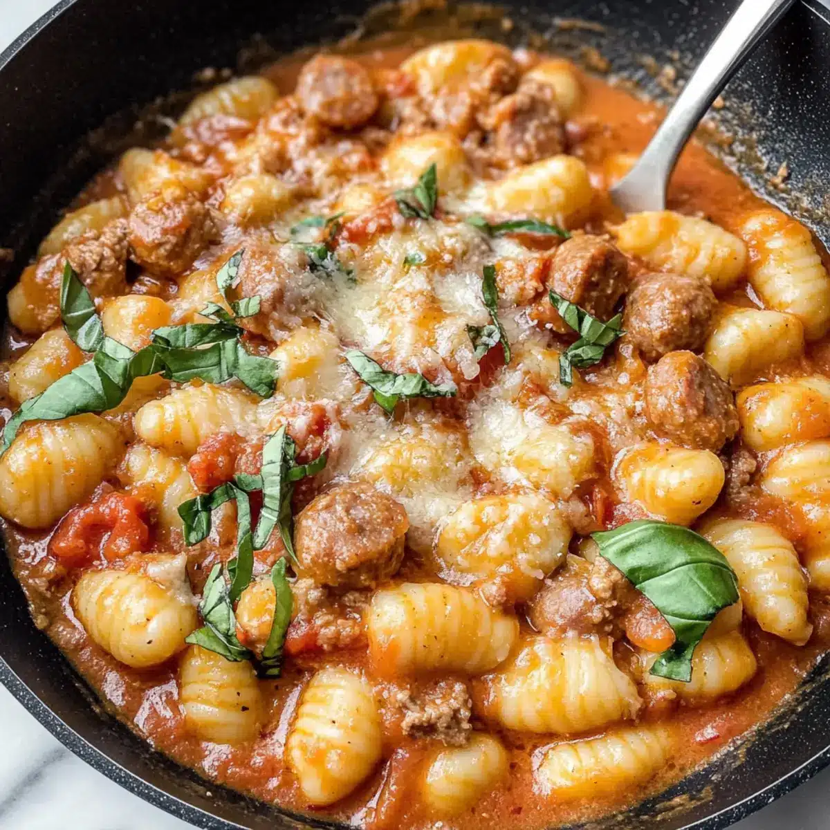 Reichhaltiger Geschmack: Die Kombination aus Wurst, cremiger Tomatensauce und zarten Gnocchi schafft ein himmlisches Geschmackserlebnis.