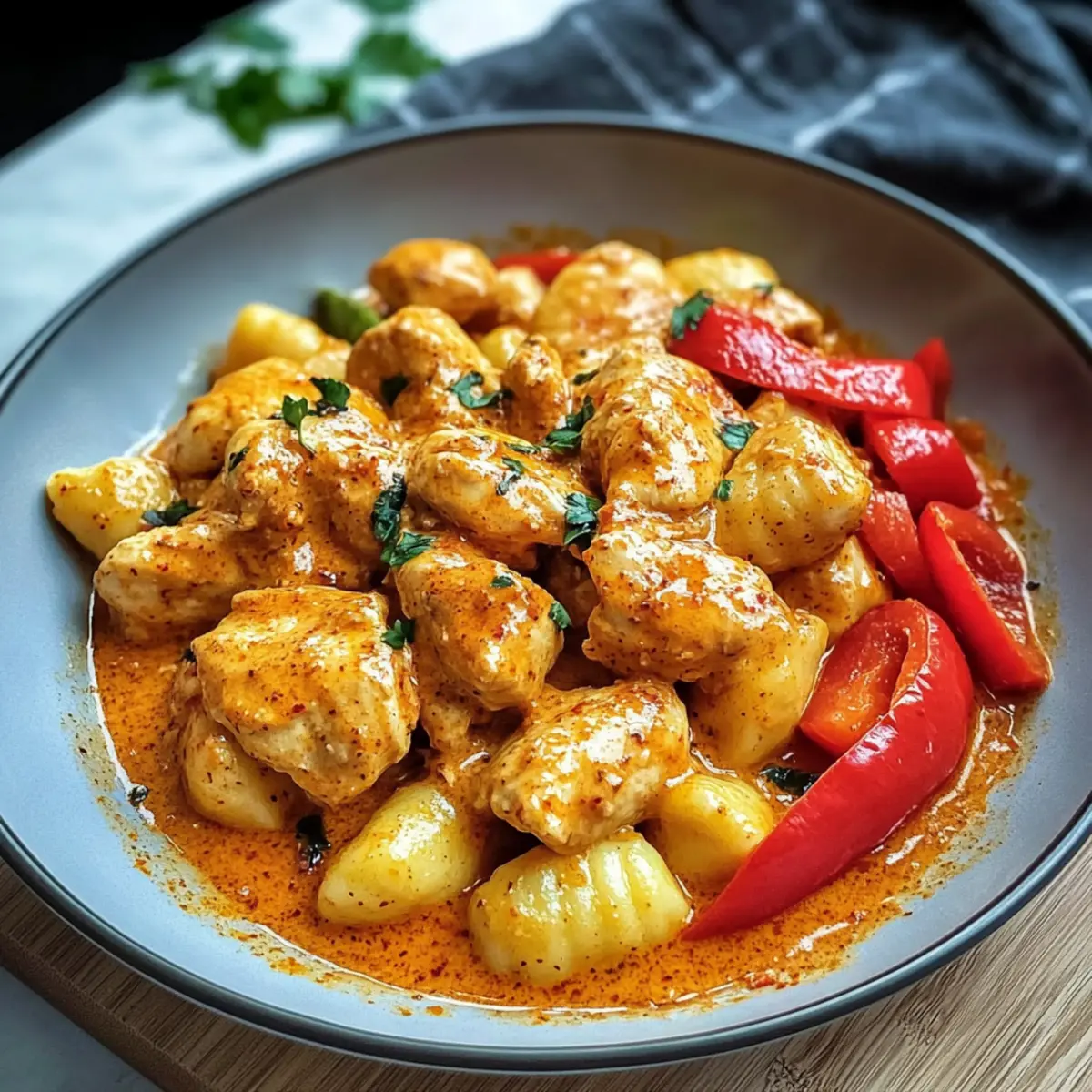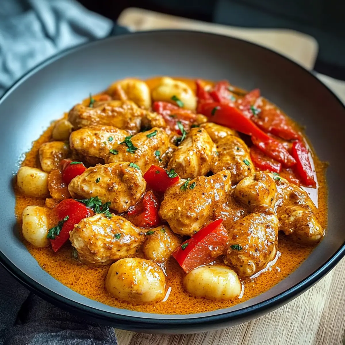 Mit diesen reichhaltigen Zutaten zaubern Sie das einfache und köstliche Paprika-Sahne-Hähnchen mit Gnocchi im Handumdrehen. Viel Spaß beim Kochen!