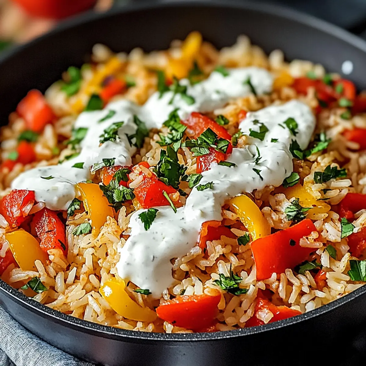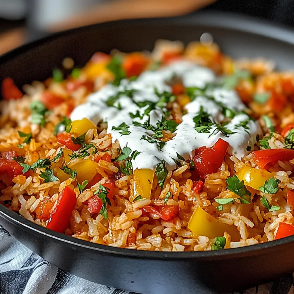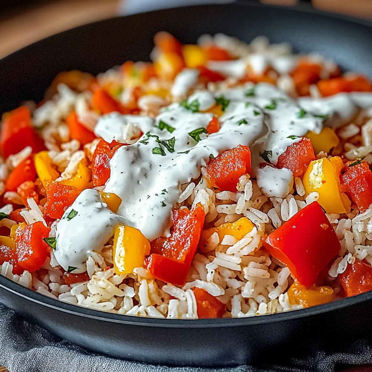Serviere die fertige Paprika-Reis-Pfanne warm auf Tellern und träufle die Joghurtsoße darüber. Du kannst zusätzlich frische Kräuter oder Nüsse als Topping hinzufügen, um das Gericht noch ansprechender zu gestalten. Genieße etwas Zeit mit Familie oder Freunden bei diesem köstlichen Pfannengericht mit Joghurtsoße!