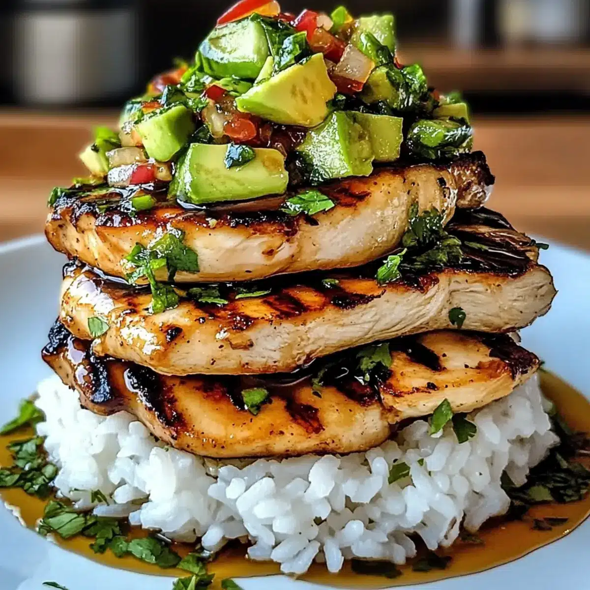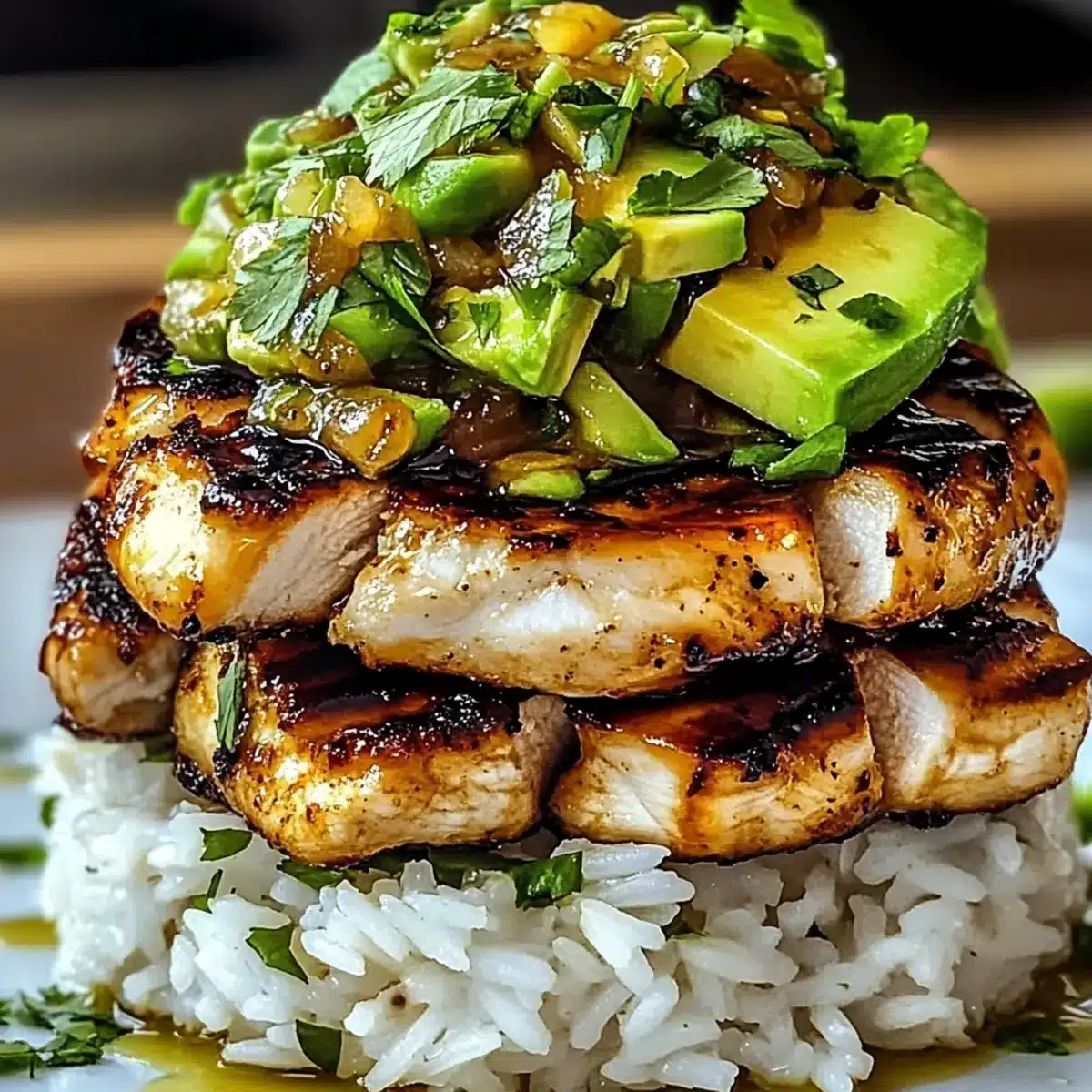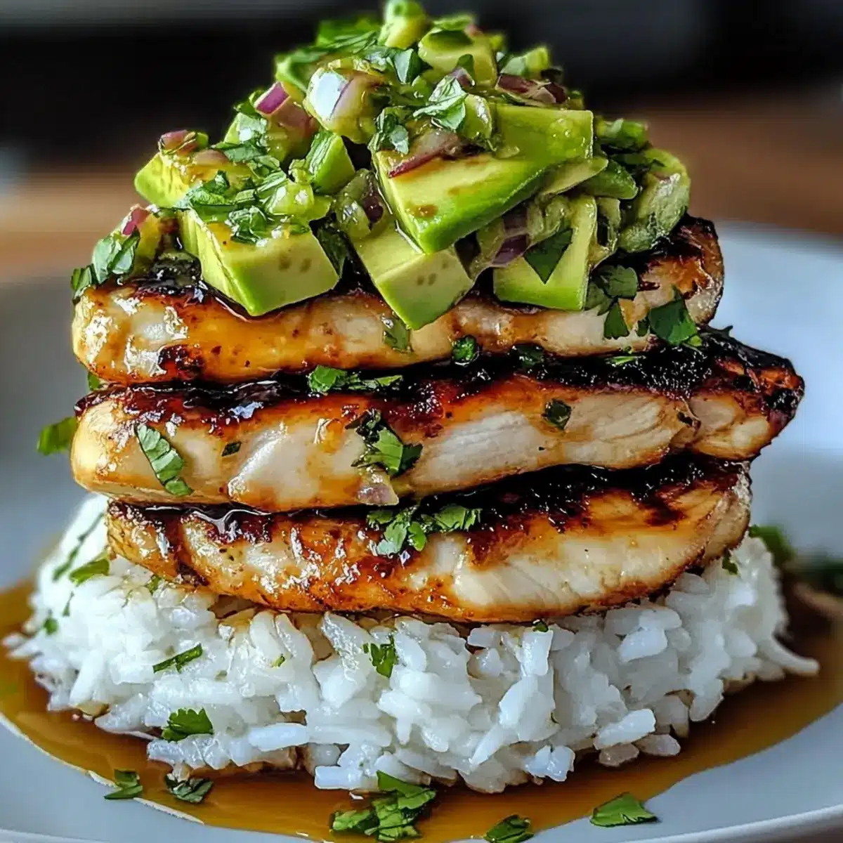 - Stack zusammenstellen: Reis auf einem Teller anrichten, gegrilltes Hühnchen darauf legen und die Avocado-Mischung darauf verteilen.