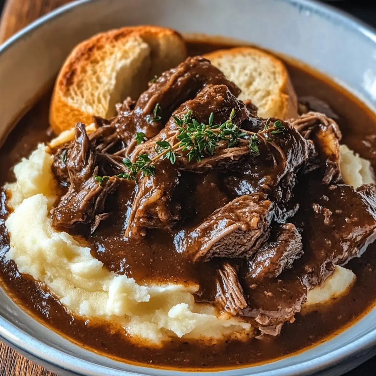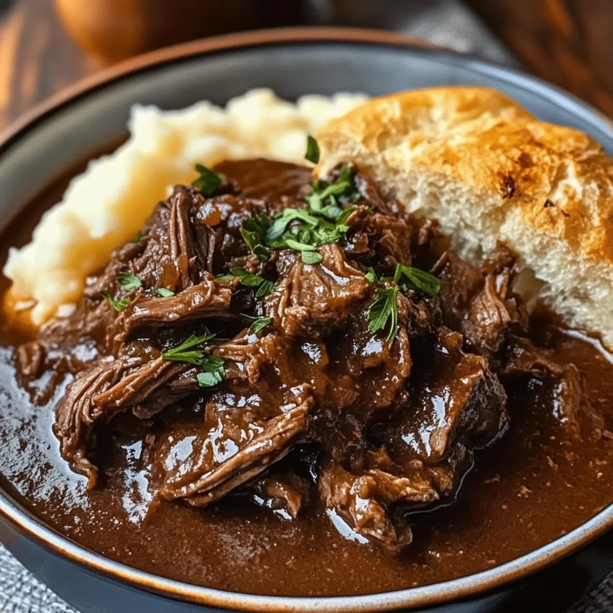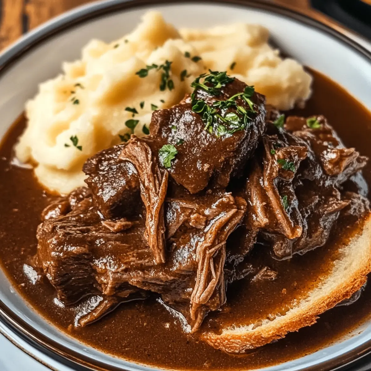 Zum Servieren lege eine Scheibe Brot auf einen Teller und darauf eine Portion Püreekartoffeln. Füge das shredded Rindfleisch hinzu und löffele die reiche, glänzende Soße über alles. Genieße dein zartes Schmoren Rindfleisch Manhattan!