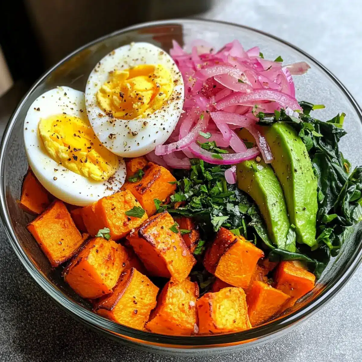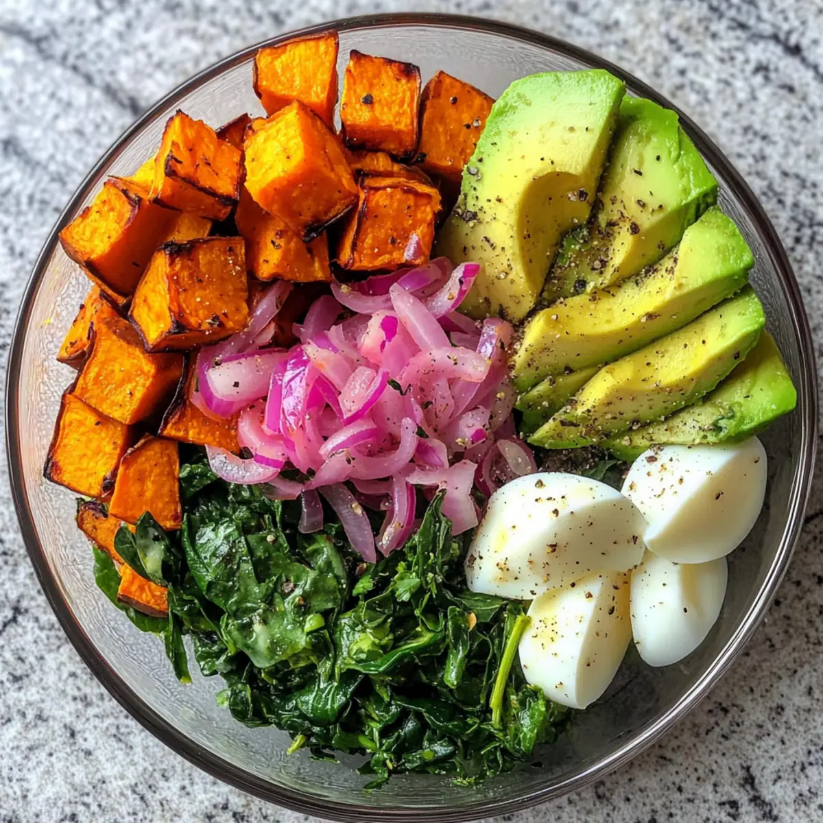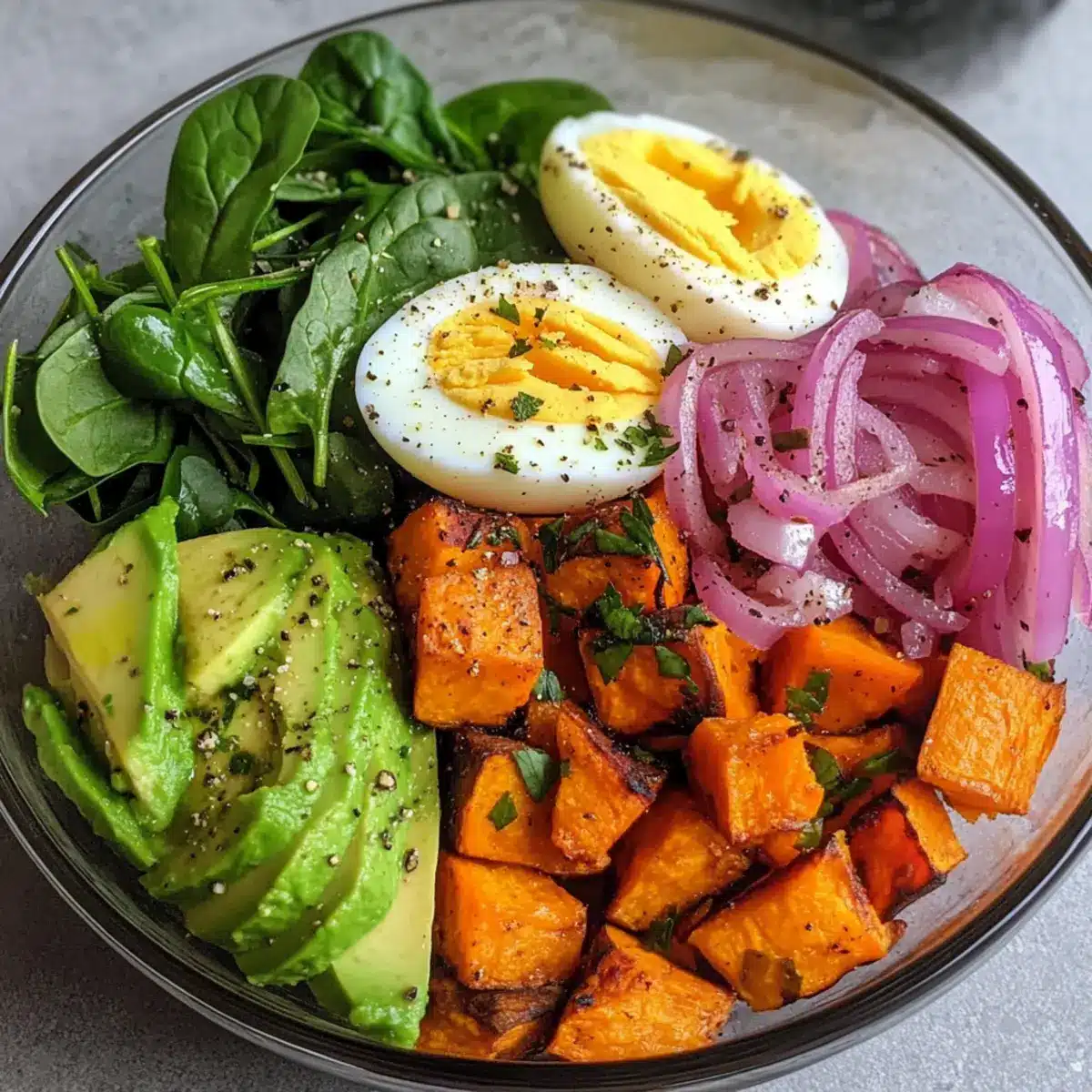- Schichten Sie die Zutaten in einer großen Schüssel: Beginnen Sie mit den gerösteten Süßkartoffeln, gefolgt von den gehackten Eiern, dem Spinat und den eingelegten Zwiebeln. Toppen Sie mit Avocado, Koriander und roter Pfefferflocken.