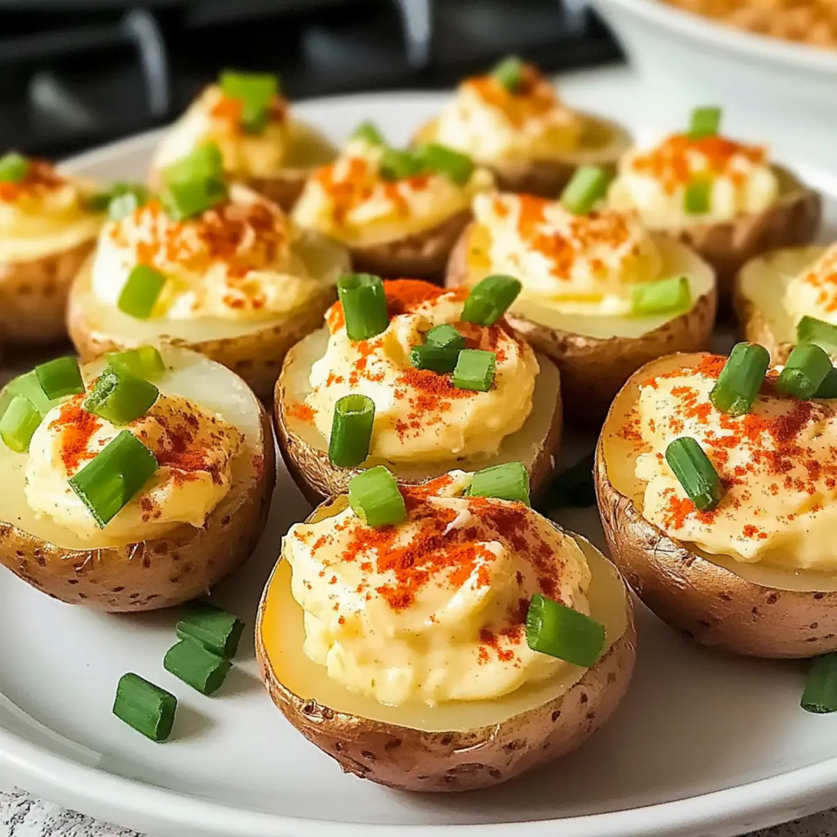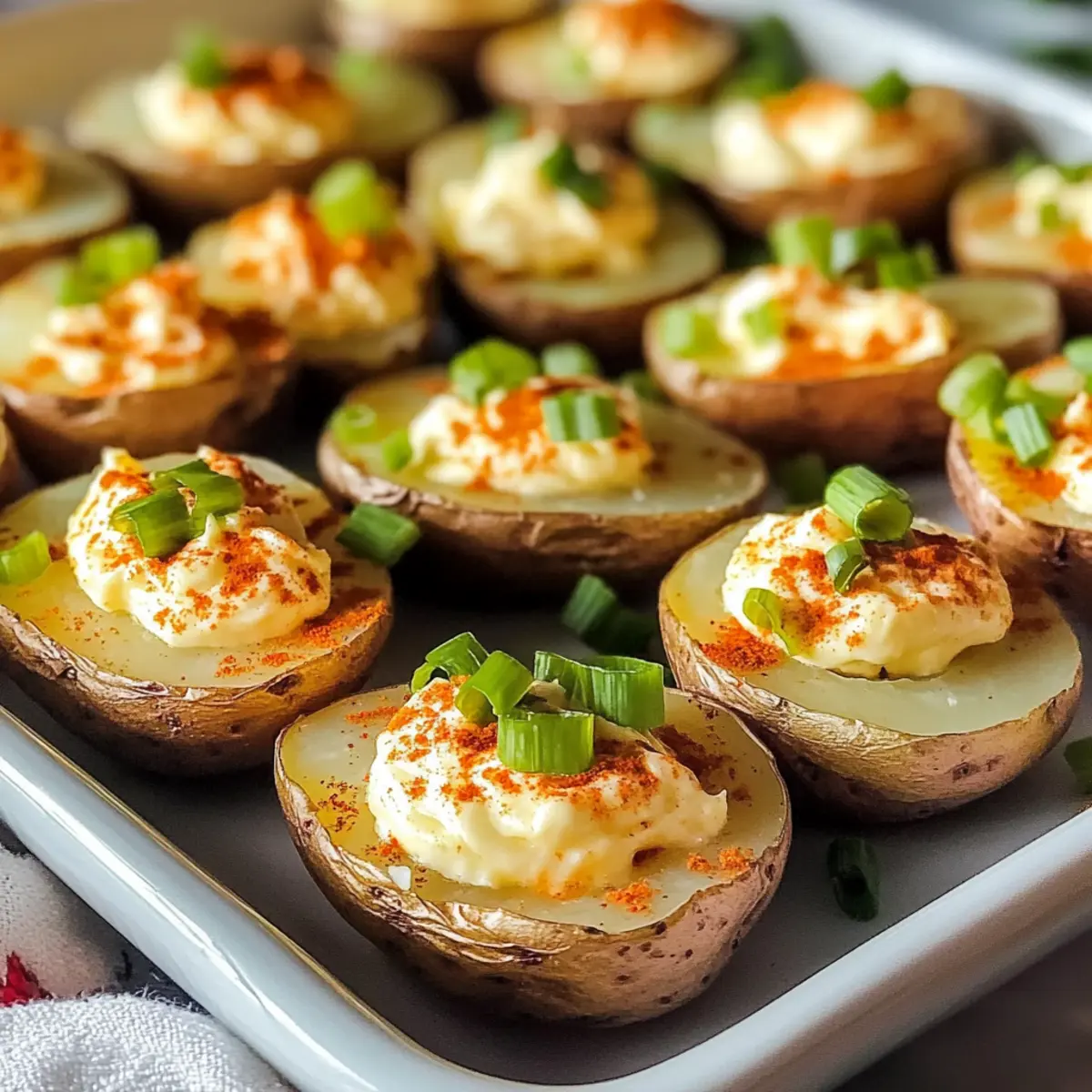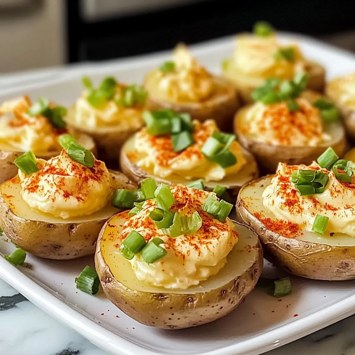 Die Teufelskartoffeln sind hervorragend für die Vorbereitung, da viele Schritte im Voraus erledigt werden können! Bereiten Sie die Baby-Kartoffeln bis zu 24 Stunden im Voraus vor, indem Sie sie kochen, abkühlen und aushöhlen. Lagern Sie die ausgehöhlten Kartoffelhälften in einem luftdichten Behälter im Kühlschrank, um ihre Frische zu erhalten. Die cremige Füllung kann ebenso bis zu 3 Tage im Voraus zubereitet werden; bewahren Sie sie in einem separaten Behälter auf. Zum Servieren füllen Sie die Kartoffeln einfach mit der Füllung, garnieren sie mit Paprika und Frühlingszwiebeln und lassen sie für mindestens 30 Minuten im Kühlschrank ruhen. Auf diese Weise genießen Sie köstliche Teufelskartoffeln mit minimalem Aufwand, was Ihnen wertvolle Zeit in der Küche spart!